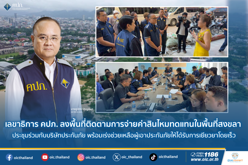 เมื่อวันที่ 7 ธันวาคม 2568 สำนักงานคณะกรรมการกำกับและส่งเสริมการประกอบธุรกิจประกันภัย (สำนักงาน คปภ.) โดย นายชูฉัตร ประมูลผล เลขาธิการ คปภ. พร้อมด้วย นางสาววสุมดี วสีนนท์ รองเลขาธิการ ด้านกำกับคนกลาง และประกันภัยภูมิภาค และคณะ ได้ลงพื้นที่จังหวัดสงขลาเพื่อประชุมร่วมกับผู้แทนบริษัทประกันภัย โดยได้ติดตามสถานการณ์อุทกภัยและกำหนดมาตรการเร่งด่วนในการช่วยเหลือผู้เอาประกันภัย หลังหลายพื้นที่ได้รับผลกระทบรุนแรงส่งผลกระทบต่อชีวิต ทรัพย์สิน และการประกอบกิจการของประชาชนจำนวนมาก