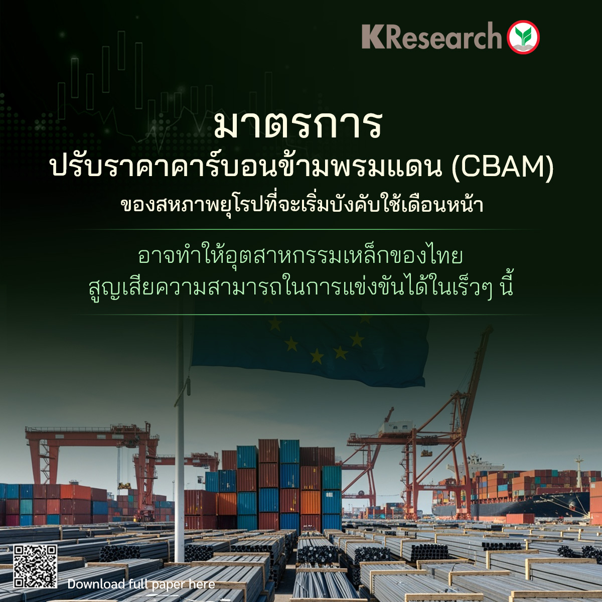 ตั้งแต่วันที่ 1 มกราคม 2569 สหภาพยุโรปจะเริ่มจัดเก็บภาษีนำเข้าภายใต้มาตรการปรับราคาคาร์บอนข้ามพรมแดน (CBAM) ตามปริมาณการปล่อยก๊าซเรือนกระจกของสินค้า ทั้งทางตรงและทางอ้อมจากกระบวนการผลิตของสินค้า1 โดยในระยะแรก ศูนย์วิจัยกสิกรไทยคาดว่า CBAM จะส่งผลกระทบต่อ 3.8% ของสินค้าส่งออกของไทยไปสหภาพยุโรปในปี 2569 คิดเป็นมูลค่าประมาณ 28,000 ล้านบาท