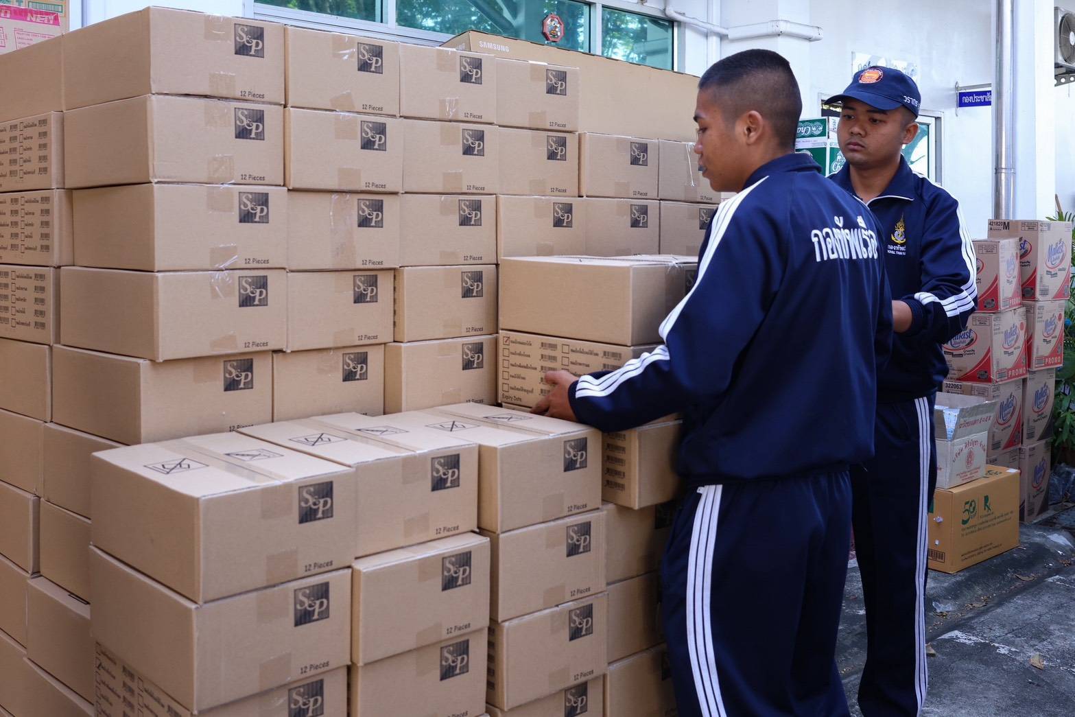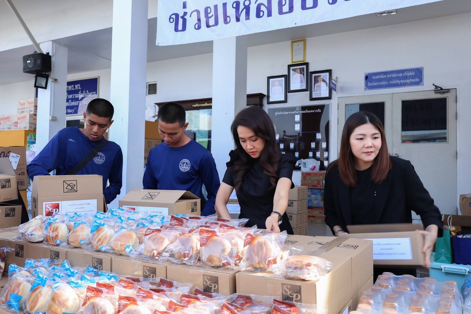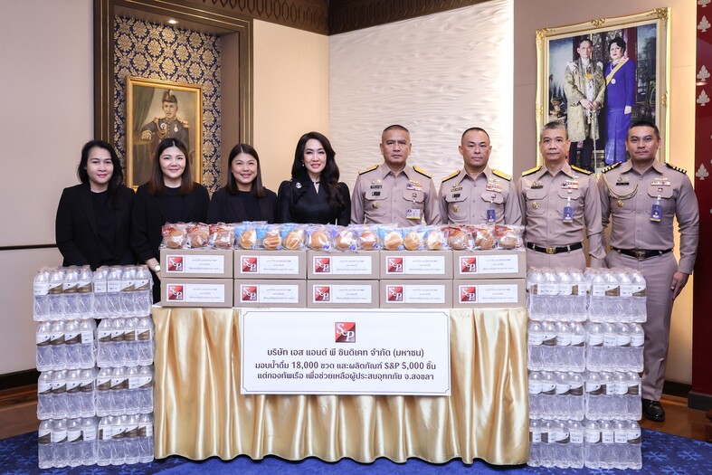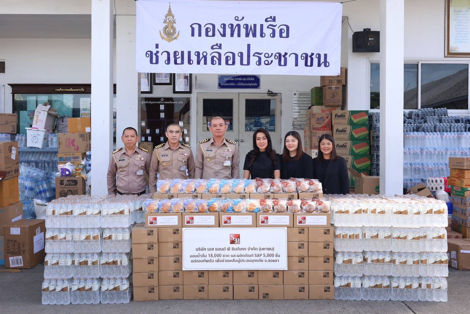 คุณมณีสุดา ศิลาอ่อน ประธานเจ้าหน้าที่สำนักพัฒนาความยั่งยืนและสื่อสารองค์กร บริษัท เอส แอนด์ พี ซินดิเคท จำกัด (มหาชน) มอบน้ำดื่ม จำนวน 18,000 ขวด และผลิตภัณฑ์ขนมปังเดลิโอ S&P จำนวน 5,004 ชิ้น มูลค่ารวม 400,104 บาท เพื่อช่วยบรรเทาความเดือดร้อนของประชาชนผู้ประสบอุทกภัยพื้นที่จังหวัดสงขลา และจังหวัดใกล้เคียง ภายใต้โครงการ ”S&P รวมใจช่วยภัยน้ำท่วม ปี 2568“ โดยมี พลเรือเอก ไพโรจน์ เฟื่องจันทร์ ผู้บัญชาการทหารเรือ (ที่ 4 จากขวา) ให้เกียรติรับมอบ ณ กองบัญชาการทหารเรือ ระหว่างวันที่ 27-28 พฤศจิกายน 2568