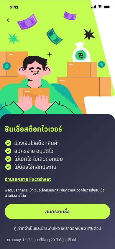 สำหรับคุณสมบัติของผู้สมัครสินเชื่อสต็อกไวเวอร์ ต้องเป็นบุคคลธรรมดาที่ประกอบธุรกิจการค้ารายย่อย ไม่ว่าเป็นเจ้าของร้านค้าย่อยหรือธุรกิจขนาดเล็ก เจ้าของกิจการซื้อมาขายไป หรือซื้อสินค้าวัตถุดิบเพื่อประกอบธุรกิจ และมีสัญชาติไทย อายุระหว่าง 20 - 70 ปี สามารถยื่นสมัครขอสินเชื่อได้ โดยไม่ต้องใช้หลักประกันผ่านแอปพลิเคชันไวเวอร์ (Vyvr) พร้อมให้บริการสำหรับผู้ใช้โทรศัพท์มือถือที่รองรับระบบปฏิบัติการแอนดรอยด์ และ iOS ยืนยันตัวตนผ่าน K PLUS โดยมีอัตราดอกเบี้ย 25-33% ต่อปี คำนวณดอกเบี้ยแบบลดต้นลดดอก หากไม่ใช้วงเงินก็ไม่ต้องเสียดอกเบี้ย ลูกค้าจึงสามารถมีวงเงินไว้ใช้หมุนเวียนในธุรกิจค้าขายได้อย่างต่อเนื่องทันท่วงที ศึกษารายละเอียดเพิ่มเติมได้ที่ https://www.vyvr.co