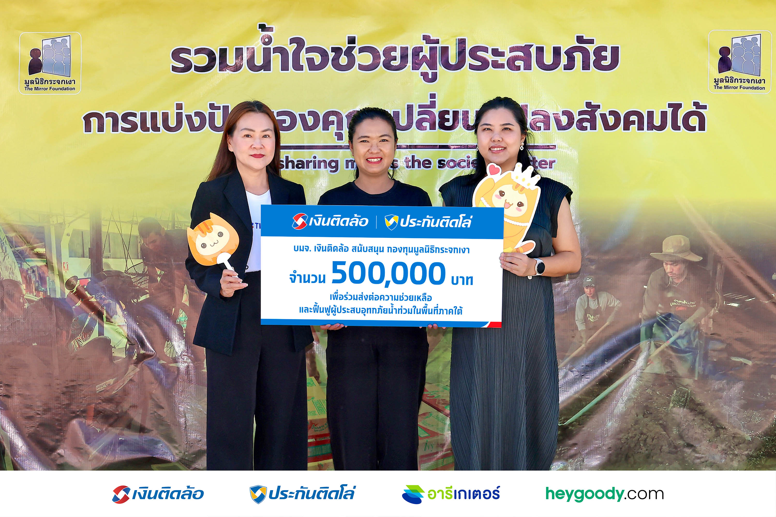 จากสถานการณ์น้ำท่วมที่ส่งผลกระทบต่อพื้นที่หลายจังหวัดในภาคใต้ บริษัท เงินติดล้อ จำกัด (มหาชน) บริษัทในกลุ่ม Tidlor Holdings (TIDLOR) โดย นางสาวนิภา วนิชวัฒน์ (ซ้าย) ผู้บริหารระดับสูง สายงานกิจกรรมเพื่อสังคม เป็นตัวแทนชาวเงินติดล้อ มอบเงินจำนวน 500,000 บาท ให้กับโครงการกองทุนฉุกเฉินมูลนิธิกระจกเงา ผ่านช่องทางเทใจดอทคอม เพื่อสนับสนุนภารกิจช่วยเหลือและฟื้นฟูผู้ประสบอุทกภัยในพื้นที่ภาคใต้ ปี 2568 โดยได้รับเกียรติจาก นางสาวเอด้า จิรไพศาลกุล (ขวา) ผู้บริหารเทใจดอทคอม และ นางสาวลักขณา ศิริกาล (กลาง) หัวหน้าฝ่ายประชาสัมพันธ์ มูลนิธิกระจกเงา เป็นผู้รับมอบ ณ สำนักงานมูลนิธิกระจกเงา ถนนวิภาวดีรังสิต กรุงเทพฯ