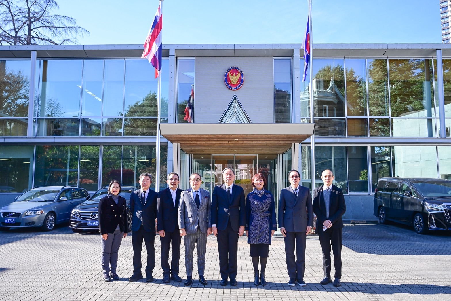 นางสาวศุกร์ศิริ อภิญญานุวัฒน์ ประธานกรรมการ ธนาคารเพื่อการส่งออกและนำเข้าแห่งประเทศไทย (EXIM BANK) พร้อมด้วยนายบัณฑิต สะเพียรชัย ประธานกรรมการบริหาร EXIM BANK นำคณะกรรมการและผู้บริหาร EXIM BANK เข้าเยี่ยมคารวะนายวิชชุ เวชชาชีวะ เอกอัครราชทูต ณ กรุงโตเกียว พร้อมหารือแนวทางการต่อยอดความร่วมมือ แลกเปลี่ยนข้อมูลเชิงนโยบาย และร่วมวางกรอบการทำงานเพื่อส่งเสริมผู้ประกอบการไทยในการขยายตลาดสู่ประเทศญี่ปุ่นและภูมิภาคเอเชีย ภายใต้บทบาทของ EXIM BANK ในฐานะสถาบันการเงินเฉพาะกิจของรัฐ ที่มุ่งสนับสนุนผู้ประกอบการไทย โดยเฉพาะผู้ประกอบการขนาดกลางและขนาดย่อม (SMEs) ให้สามารถเข้าถึงโอกาสทางการค้าและการส่งออก ผ่านการสร้างเครือข่ายความร่วมมือกับหน่วยงานภาครัฐและพันธมิตรในต่างประเทศ