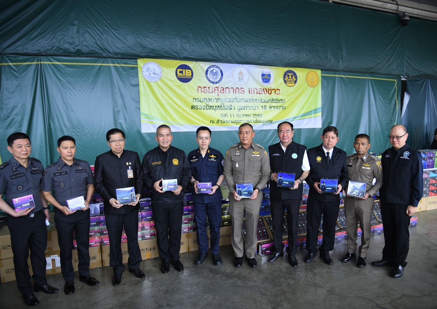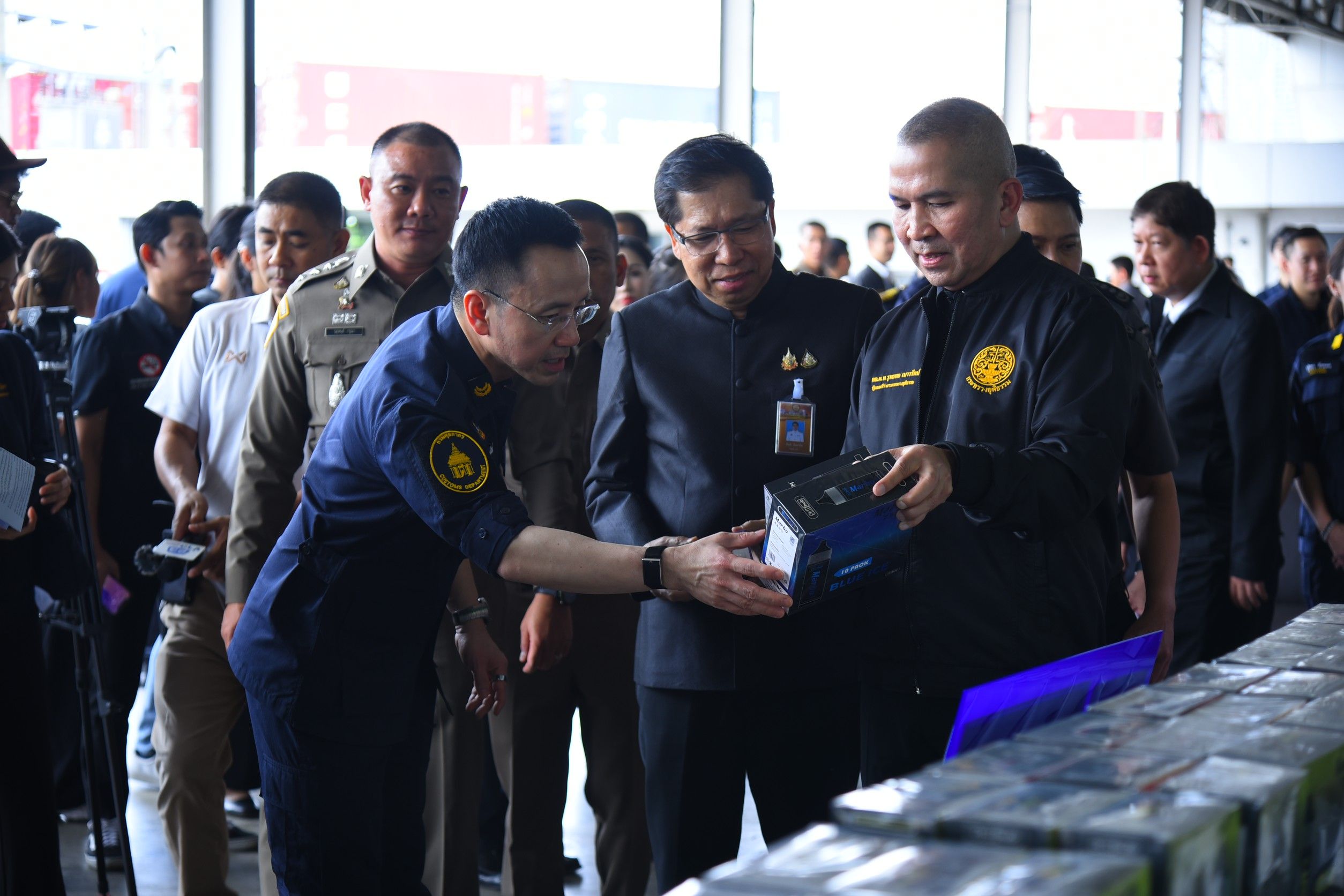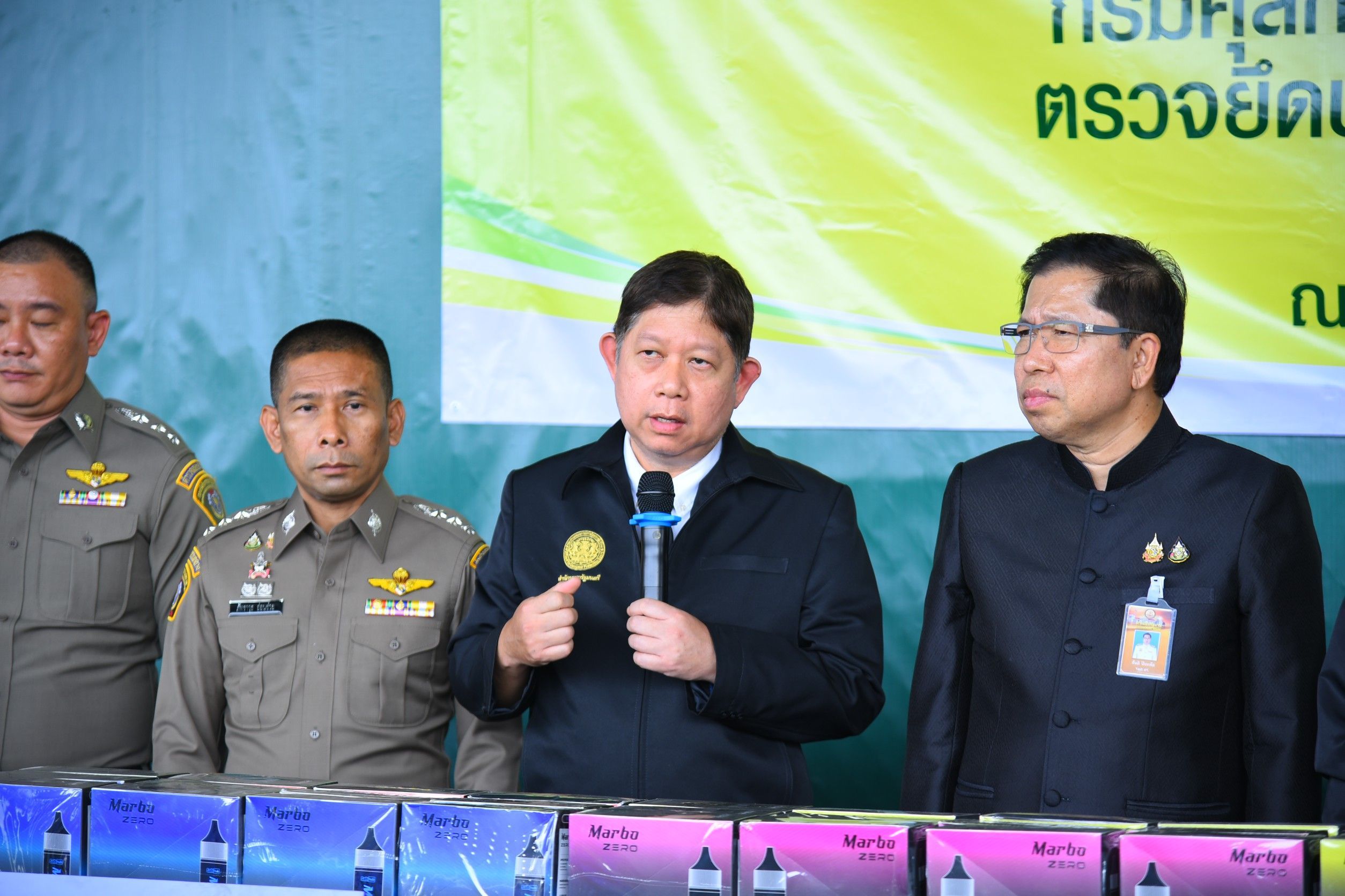 นายสันติ ปิยะทัต รัฐมนตรีประจำสำนักนายกรัฐมนตรี พล.ต.ท.รุทธพล เนาวรัตน์ รัฐมนตรีว่าการกระทรวงยุติธรรม พ.ต.ต.ยุทธนา แพรดำ อธิบดีกรมสอบสวนคดีพิเศษ นายพันธ์ทอง ลอยกุลนันท์ อธิบดีกรมศุลกากร ผศ.อัครนันท์ อริยศรีพงษ์ ที่ปรึกษารัฐมนตรีช่วยว่าการกระทรวงสาธารณสุข นางสาวสุนทรียา ทวิชาประสิทธิ์ รองอธิบดีกรมศุลกากร นายรณรงค์ พูลพิพัฒน์ เลขาธิการคณะกรรมการคุ้มครองผู้บริโภค นายธนกฤต ลิ้นทอง ผู้อำนวยการสำนักงานศุลกากรท่าเรือกรุงเทพ พล.ต.ต. ทัศน์ภูมิ จารุปรัชน์ ผู้บังคับการปราบปรามการกระทำความผิดเกี่ยวกับอาชญากรรมทางเศรษฐกิจ กองบัญชาการตำรวจสอบสวนกลาง นายแพทย์ชยนันท์ สิทธิบุศย์ ผู้อำนวยการกองงานคณะกรรมการควบคุมผลิตภัณฑ์ยาสูบ กรมควบคุมโรค นายกฤษดา สุขการีย์ รองผู้อํานวยการฝ่ายปฏิบัติการเรือและสินค้า การท่าเรือแห่งประเทศไทย ร่วมแถลงข่าวตรวจยึด “บุหรี่ไฟฟ้า” ชนิดใช้แล้วทิ้ง จำนวน 46,260 ชิ้น มูลค่า 10,871,100 บาท ซึ่งเป็นของต้องห้ามในการนำเข้ามาในราชอาณาจักร ณ สำนักงานศุลกากรท่าเรือกรุงเทพ กรมศุลกากร
