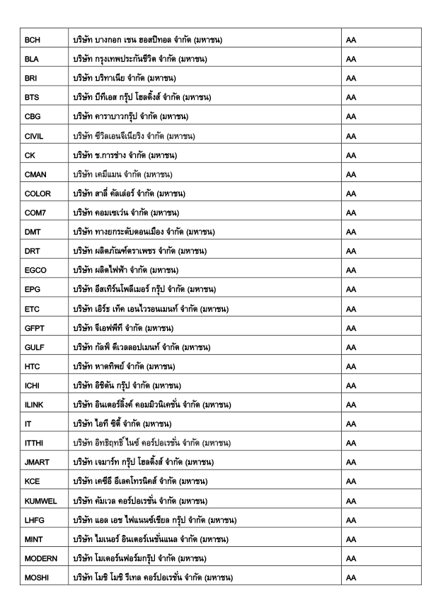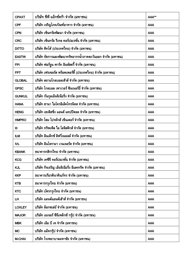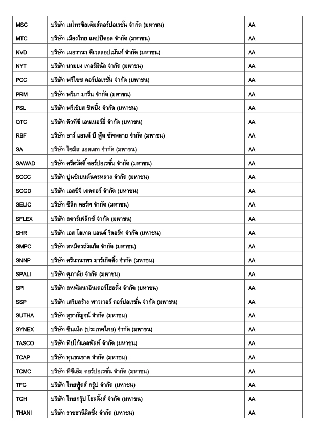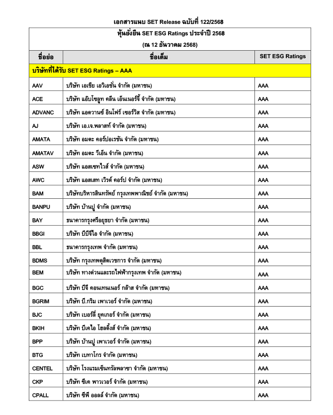ผลการประเมินประกอบด้วย ระดับ AAA จำนวน 102 บริษัท ระดับ AA จำนวน 80 บริษัท ระดับ A จำนวน 67 บริษัท และระดับ BBB จำนวน 16 บริษัท คิดเป็นมูลค่าหลักทรัพย์ตามราคาตลาดรวม 70% เมื่อเทียบกับมูลค่าหลักทรัพย์ตามราคาตลาดทั้งหมดของ SET และ mai (ณ 11 ธันวาคม 2568)