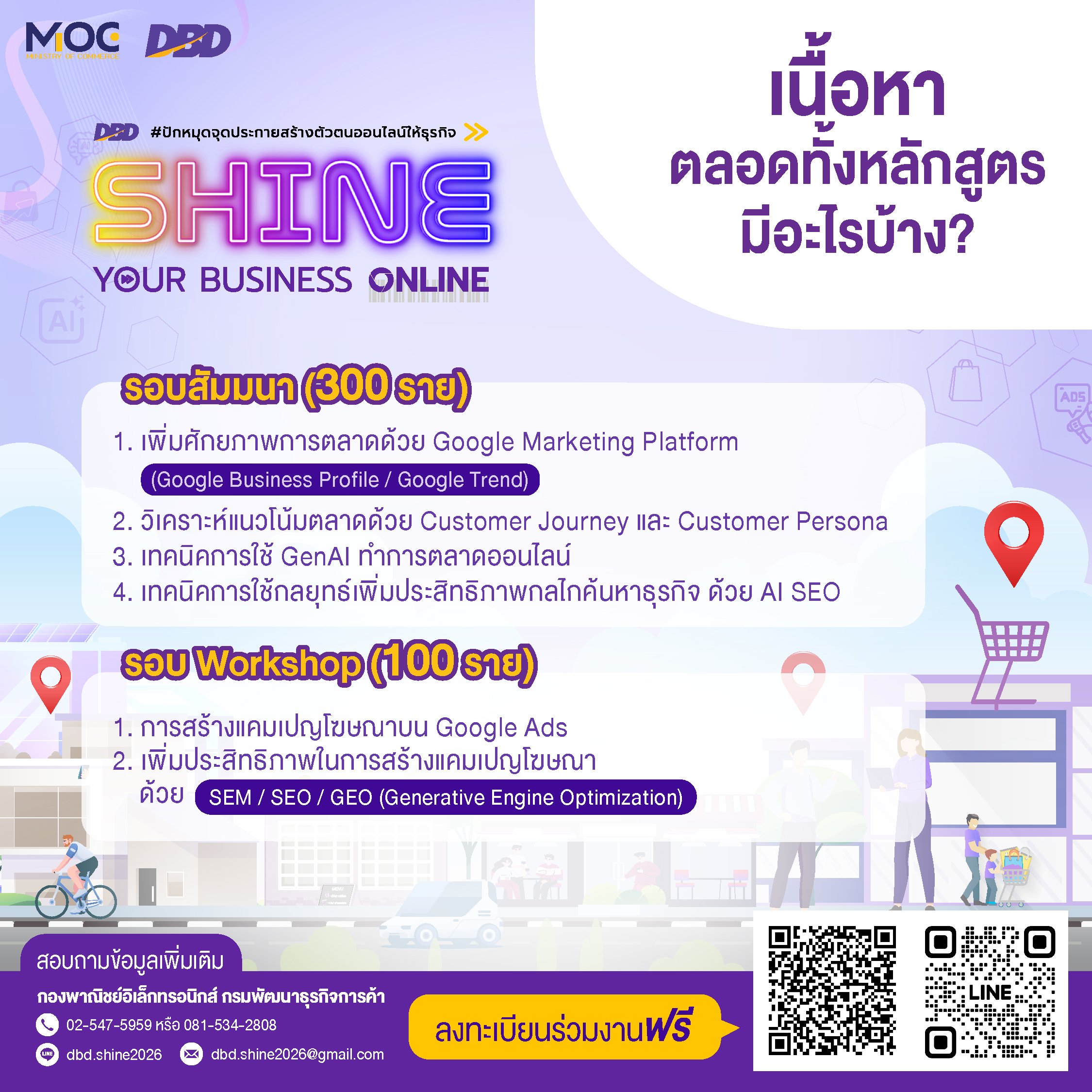 กรมพัฒนาธุรกิจการค้า เดินหน้าจัดกิจกรรม 'SHINE YOUR BUSINESS ONLINE #ปักหมุดจุดประกายสร้างตัวตนออนไลน์ให้ธุรกิจ' ปีที่ 2 (SHINE Season 2) เสริมทักษะเทคโนโลยี การตลาดออนไลน์แบบเข้มข้น ครบทั้งสัมมนา เวิร์กช็อป และโค้ชชิ่งเชิงลึก เพื่อปั้นผู้ประกอบการไทยสู่แนวหน้า พร้อมสร้างตัวตนบนโลกออนไลน์ด้วย Google Platform ตลอดจนเสริมการใช้ AI เป็นเครื่องมือเพิ่มประสิทธิภาพการตลาดธุรกิจดิจิทัล สมัครได้แล้วตั้งแต่วันนี้-31 มกราคม 2569 หรือจนกว่าที่นั่งจะเต็ม