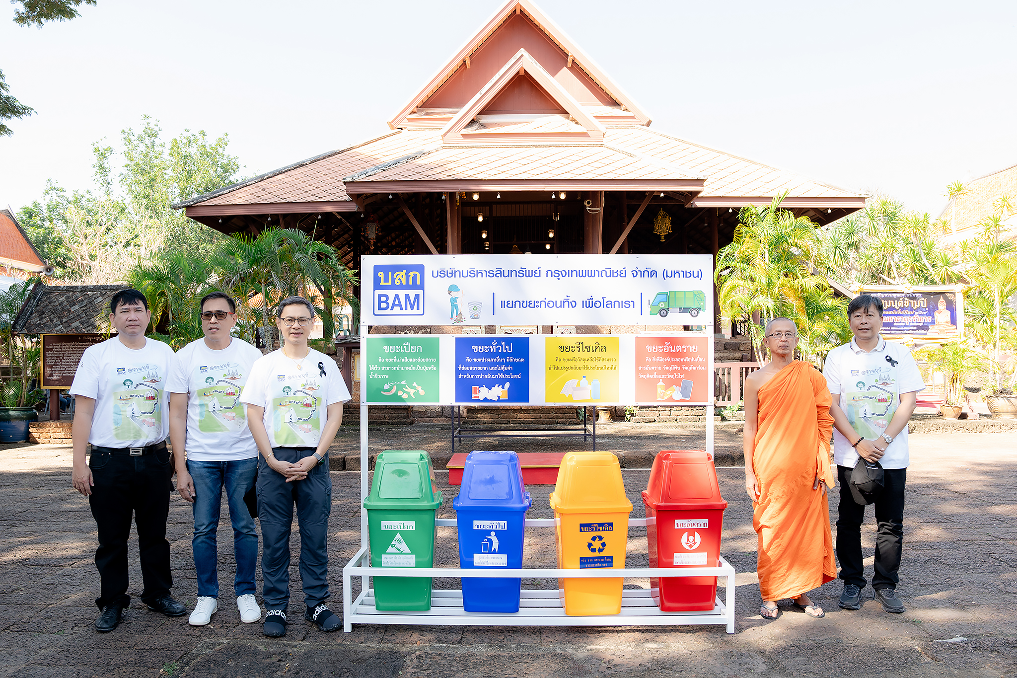 นายวีรเวช ศิริชาติไชย รองประธานเจ้าหน้าที่บริหาร สายสนับสนุนองค์กร บริษัทบริหารสินทรัพย์ กรุงเทพพาณิชย์ จำกัด (มหาชน) หรือ BAM พร้อมด้วย นายสันธิษณ์ วัฒนกุล ประธานเจ้าหน้าที่บริหาร บริษัท บริหารสินทรัพย์อารีย์ จำกัด หรือ ARI ร่วมถวายชุดโครงเหล็กพร้อมถังขยะแยกประเภท โดยมี พระมหาสุนทร สุนฺทโร รองเจ้าอาวาส วัดมหาธาตุวรวิหาร จ.ราชบุรี และเจ้าคณะ อำเภอเมืองราชบุรี เป็นผู้รับมอบ เพื่อรณรงค์ปลูกฝังให้พุทธศาสนิกชนเกิดจิตสำนึกในการรักษาสิ่งแวดล้อมควบคู่กับจรรโลงพระพุทธศาสนา ซึ่งเป็นส่วนหนึ่งของกิจกรรมลูกค้าสัมพันธ์ ฝ่ายสื่อสารองค์กร ภายใต้ชื่องาน “BAM Fine Day @ Ratchaburi ”
