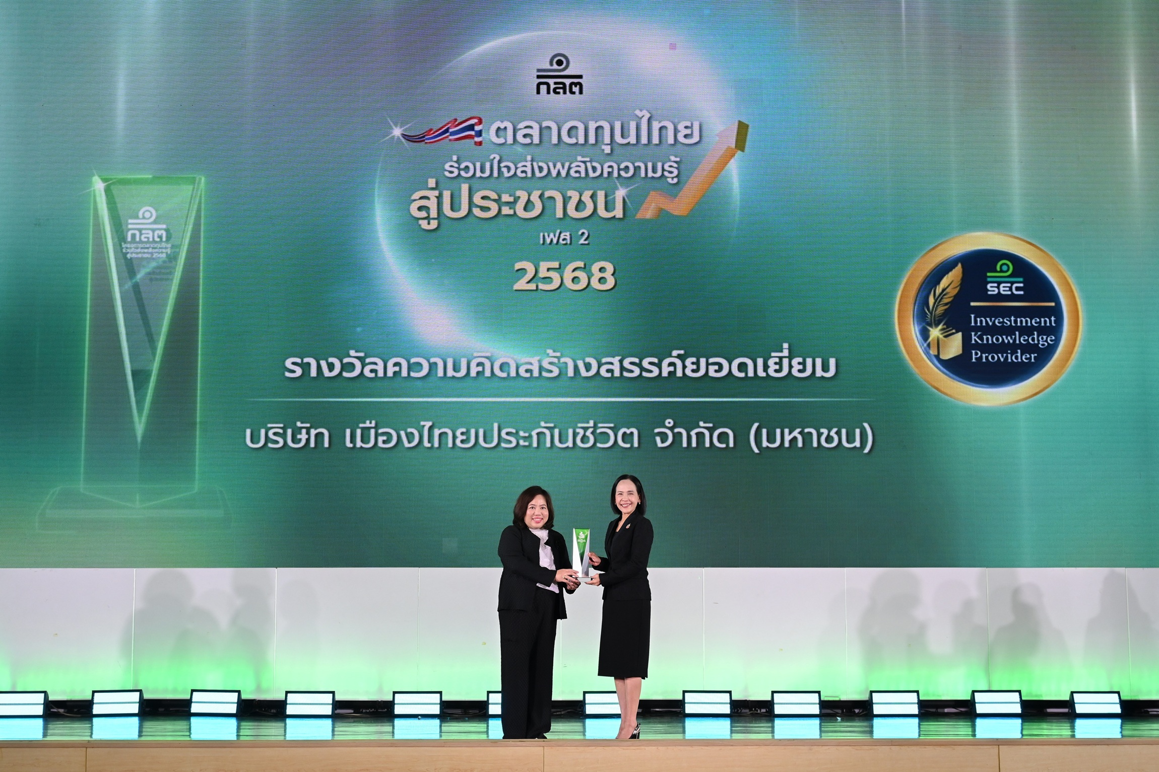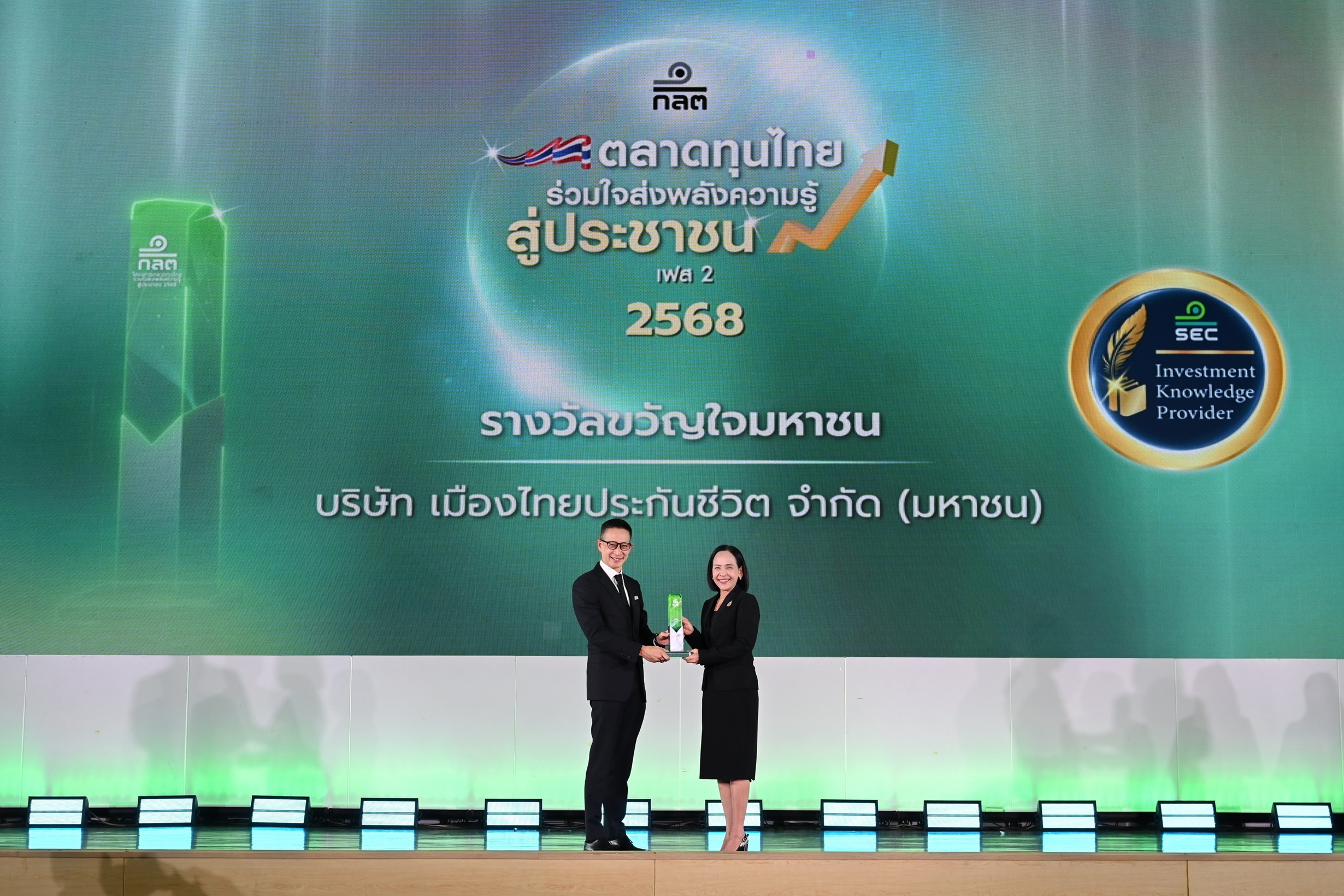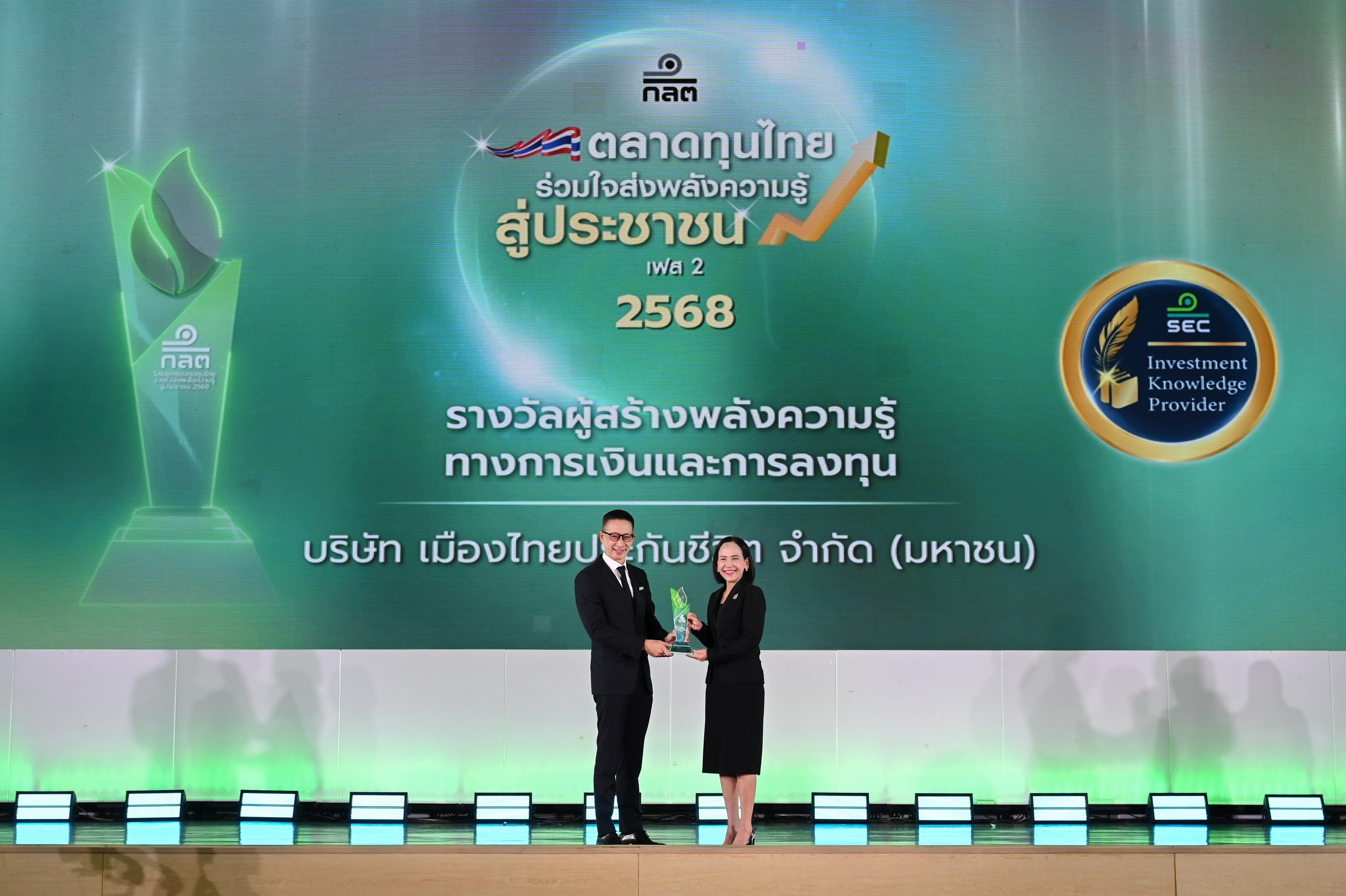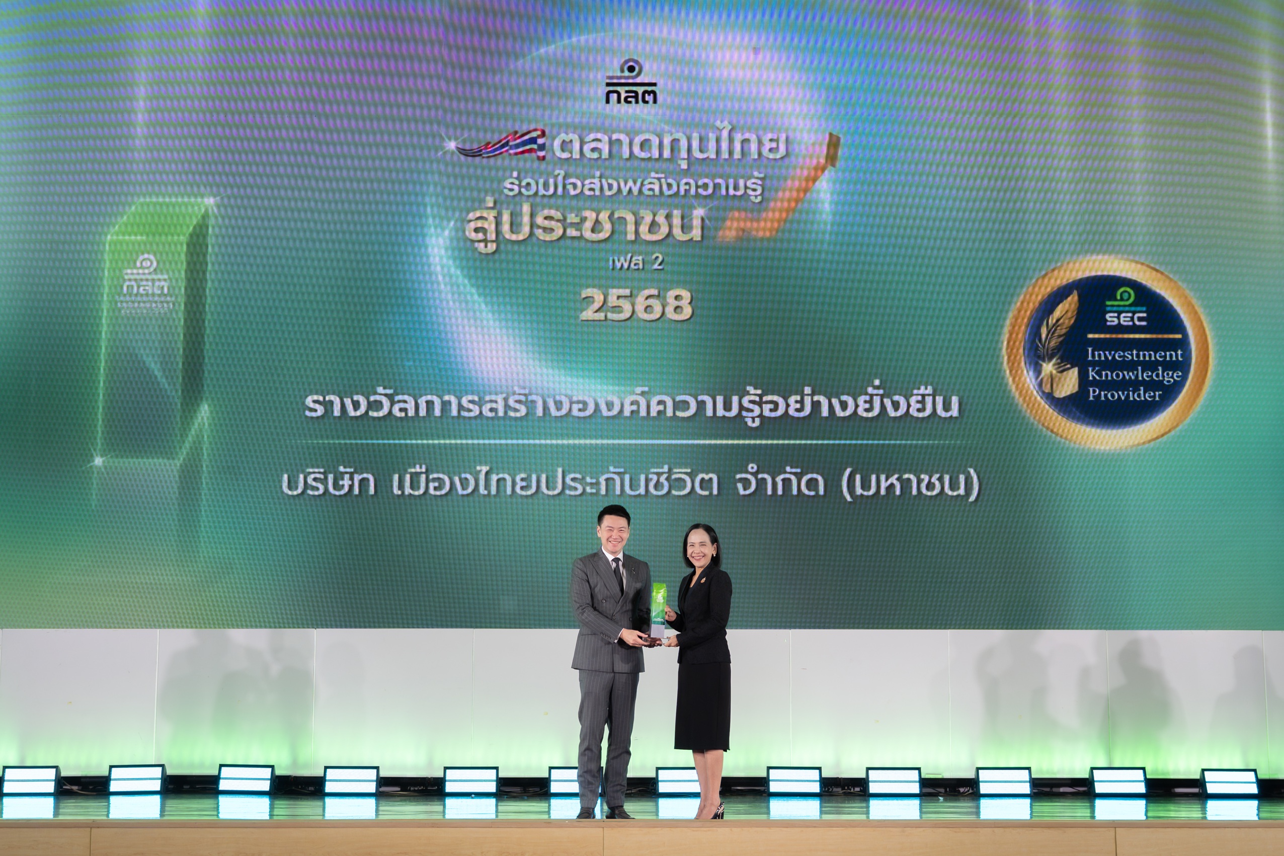 บริษัท เมืองไทยประกันชีวิต จำกัด (มหาชน) คว้า 4 รางวัล จากโครงการ "ตลาดทุนไทยร่วมใจส่งพลังความรู้ สู่ประชาชน เฟส 2 ปี 2568" ซึ่งจัดโดยสำนักงานคณะกรรมการกำกับหลักทรัพย์และตลาดหลัก ทรัพย์ (ก.ล.ต.) สะท้อนบทบาทขององค์กรในการขับเคลื่อนการพัฒนาความรู้ด้านการเงิน การประกัน และการลงทุน (Financial and Insurance Literacy) ให้แก่ประชาชนไทยอย่างเป็นรูปธรรม ภายใต้กรอบการพัฒนาที่ยั่งยืน (ESG) และความรับผิดชอบต่อสังคมในการเสริมสร้างภูมิคุ้มกันทางการเงินในระยะยาว