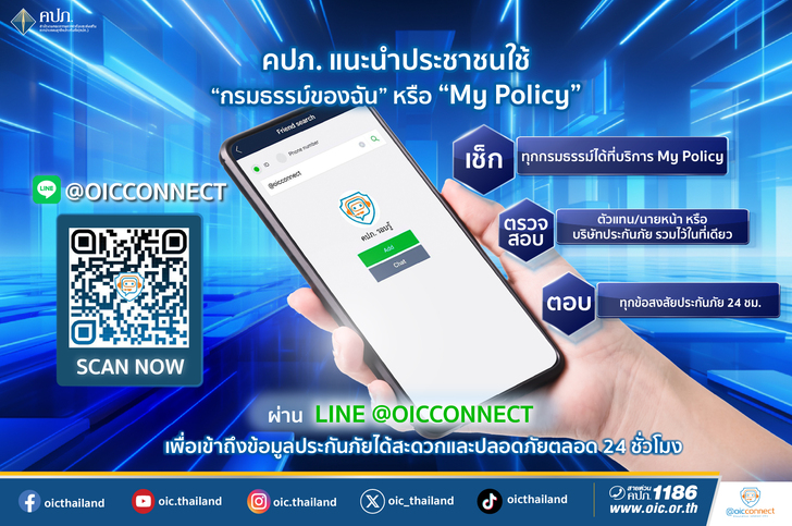 สำนักงาน คปภ. ขอเชิญชวนให้ประชาชนใช้บริการ OICConnect เป็นหนึ่งในช่องทางหลักในการตรวจสอบข้อมูล ด้านประกันภัย เพื่อให้ได้รับข้อมูลที่ถูกต้อง ทันสมัย และสามารถดำเนินการที่เกี่ยวข้องได้อย่างรวดเร็วและมีประสิทธิภาพ พร้อมทั้งยืนยันว่า OICConnect ได้รับการพัฒนาให้มีมาตรฐานความปลอดภัยด้านข้อมูลตามหลักเกณฑ์ที่เหมาะสม และรองรับการใช้งานได้ตลอดเวลา โดยเฉพาะฟีเจอร์ “กรมธรรม์ของฉัน” (My Policy) ที่ช่วยให้ผู้เอาประกันภัยสามารถติดตามข้อมูลกรมธรรม์ของตน จากทุกบริษัทประกันภัยได้ในที่เดียวอย่างสะดวกและครบถ้วน หากมีข้อสงสัยเพิ่มเติม สามารถติดต่อสายด่วน คปภ. 1186 ได้ เพื่อขอข้อมูลและคำแนะนำด้านการประกันภัยได้ ตลอด 24 ชั่วโมง