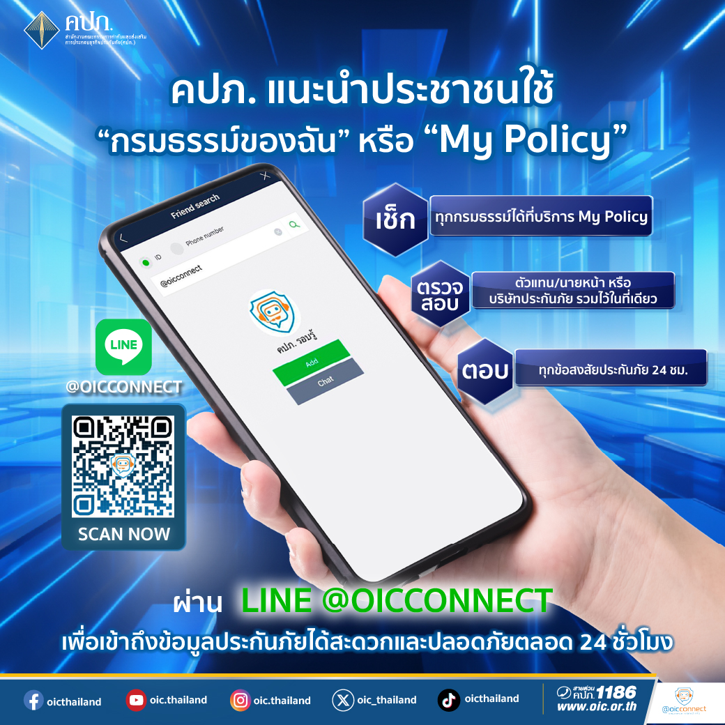 สำนักงานคณะกรรมการกำกับและส่งเสริมการประกอบธุรกิจประกันภัย (สำนักงาน คปภ.) แนะนำให้ประชาชนและผู้เอาประกันภัยใช้บริการ OICConnect - "คปภ. รอบรู้" บน LINE Official Account ซึ่งเป็นช่องทางดิจิทัลสำหรับเข้าถึงข้อมูลและบริการด้านประกันภัยได้อย่างสะดวก รวดเร็ว และปลอดภัยตลอด 24 ชั่วโมง โดยเฉพาะในช่วงเวลาที่จำเป็นต้องตรวจสอบความคุ้มครอง สิทธิประโยชน์ หรือข้อมูลกรมธรรม์อย่างทันท่วงที เพื่อยกระดับการให้บริการประชาชนในรูปแบบดิจิทัล ทำให้ผู้เอาประกันภัยสามารถเข้าถึงข้อมูลกรมธรรม์ประกันภัยของตนเองได้ทันที ลดการพึ่งพาเอกสารฉบับจริง และเพิ่มความคล่องตัวในการจัดการข้อมูลด้านประกันภัยได้อย่างมีประสิทธิภาพ