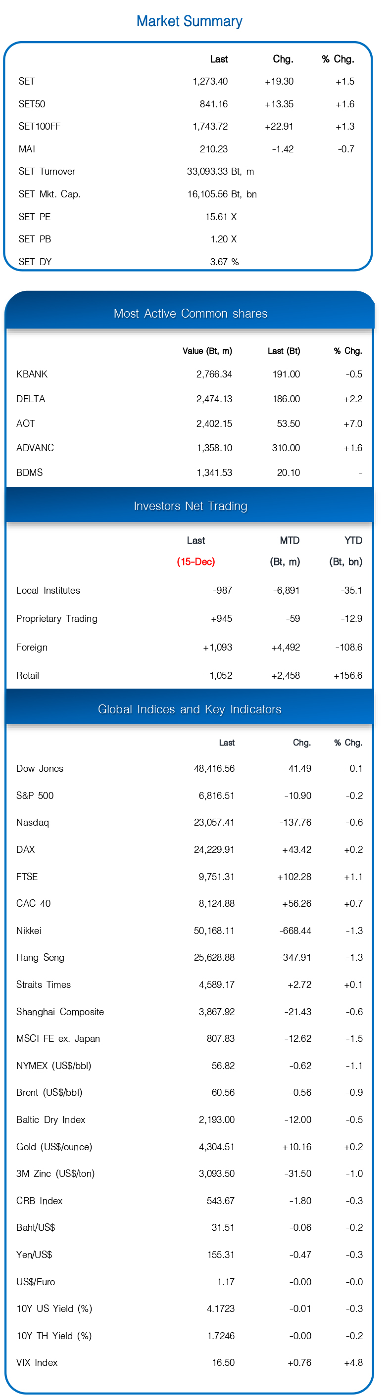 ประเด็นหุ้นน่าสนใจ: หุ้นเด่นสัปดาห์นี้ CPALL, MTC / หุ้นเด่น ธ.ค. ADVANC, AMATA, BAM, CPALL, KTB, SCCC, TASCO ทางเลือกหุ้นตปท.ผ่าน DR XIAOMI80, PANW80 / กลุ่มที่มัก Outperform ช่วงเลือกตั้ง คือ FOOD, FIN, CONMAT, ENERG, COMM หุ้นเด่น ICHI, MTC, TIDLOR, TASCO, GPSC, GULF, SPRC, CPALL, BJC, CPAXT, CRC, MRDIYT, PLANB / หุ้นที่คาดจะให้ Div. Yield ที่เหลือสูงกว่า 4% SIRI, TPIPL, KGI, NER, TEGH, SAPPE, AP, BTG, SAK, PRM, TLI, LH, THANI, SC, OSP, MC, SCCC, AIT, MBK, TQM, FM, PTTEP, SABINA, GFPT, WHAUP / หุ้นเก็ง Window Dressing - BJC, CK, CRC, MTC, PR9, PRM, SJWD / SET50 เข้า CENTEL, SAWAD ออก BCP, VGI / SET100 เข้า GFPT, PTG, STECON / ออก ITC, MBK, WHAUP / SETHD เข้า AEONTS, AMATA, TLI / ออก COM7, ITC, WHAUP / หุ้นรับประโยชน์ดบ.ขาลง ไฟแนนซ์ – BAM, MTC, TIDLOR อสังหาฯ AP, LH, SIRI, SPALI / FTSE Review ใช้ราคาปิด 19 ธ.ค. ทั้ง Large Cap, Mid Cap, Small Cap, Micro Cap ไม่มีหุ้นไทยเข้าและออก