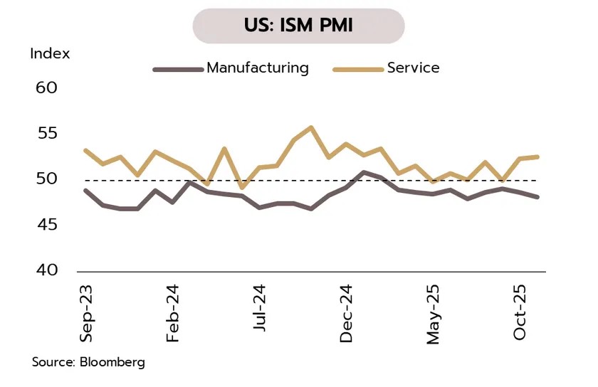 แม้ว่าเศรษฐกิจสหรัฐฯ ชะลอตัว แต่ยังไม่เห็นสัญญาณการชะลอตัวที่รุนแรง สะท้อนจากการบริโภคที่เติบโต ตลาดแรงงานที่ยังมีเสถียรภาพ และการขยายตัวของภาคบริการที่แข็งแกร่ง รวมถึงแรงหนุนจากนโยบายการคลังและการลงทุนในเทคโนโลยี AI นอกจากนี้ แผนการซื้อตั๋วเงินคลังเดือนละ 4 หมื่นล้านดอลลาร์ฯ ของเฟดยังช่วยเสริมสภาพคล่องให้กับตลาดการเงิน เมื่อประกอบกับการลดดอกเบี้ยในช่วงก่อนหน้านี้คาดว่าจะเป็นปัจจัยที่ช่วยลดทอนความเสี่ยงต่อการชะลอตัวของเศรษฐกิจ ด้วยเหตุนี้ วิจัยกรุงศรีประเมินว่าเฟดมีโอกาสปรับลดอัตราดอกเบี้ยนโยบายอีกเพียง 1 ครั้งในปี 2569