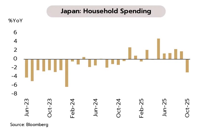 แม้ตัวเลขเศรษฐกิจญี่ปุ่นยังอ่อนแอในไตรมาส 3 แต่หลายปัจจัยยังหนุนโอกาสขึ้นดอกเบี้ยเดือนธันวาคม ในเดือนพฤศจิกายน ดัชนี PMI ภาคการผลิตหดตัวต่อเนื่องเป็นเดือนที่ 5 อยู่ที่ 48.7 ส่วน PMI ภาคบริการยังคงขยายตัวต่อเนื่องเป็นเดือนที่ 8 อยู่ที่ 53.2 ในส่วนของ GDP ไตรมาส 3 หดตัวเป็นครั้งแรกในรอบ 6 ไตรมาสอยู่ที่ -0.6% QoQ จากการลงทุนภาคธุรกิจที่ชะลอตัว ท่ามกลางความไม่แน่นอนจากมาตรการภาษีนำเข้าของสหรัฐฯ และการส่งออกที่อ่อนแรงต่อเนื่อง ขณะที่การใช้จ่ายภาคครัวเรือนหดตัวแรงสุดนับตั้งแต่เดือนมกราคม 2567 ที่ -3.0% YoY