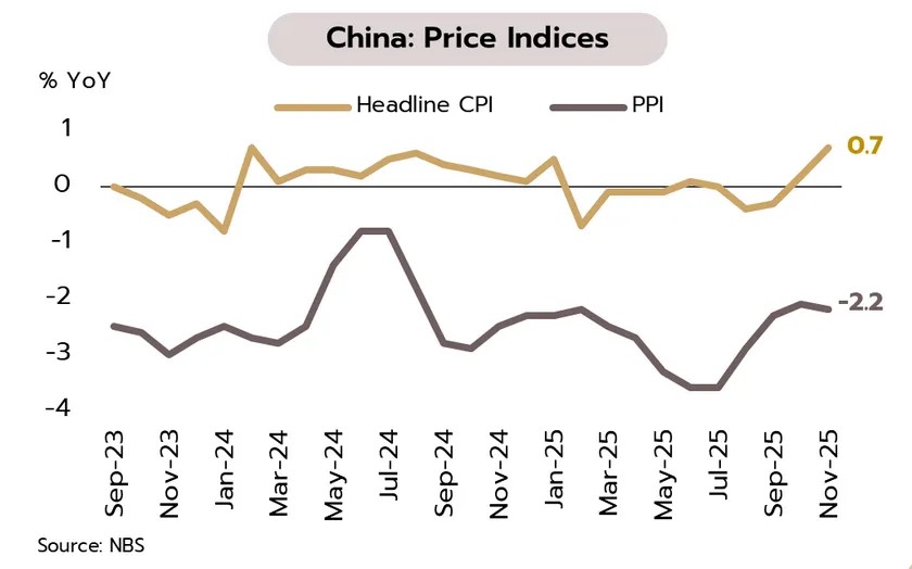 เศรษฐกิจภายในประเทศยังไร้สัญญาณการฟื้นตัวในระยะอันใกล้ ขณะที่ภาคการส่งออก ซึ่งช่วยหนุนเศรษฐกิจในระยะที่ผ่านมา เสี่ยงเผชิญกระแสการปกป้องทางการค้าที่รุนแรงขึ้น ล่าสุดเม็กซิโกได้ลงมติเห็นชอบมาตรการภาษีนำเข้ากับชาติเอเชีย ซึ่งสูงถึง 50% ในบางสินค้า ขณะที่สหภาพยุโรปอาจพิจารณาขึ้นภาษีกับจีน ด้านรัฐบาลจีนยังคงเน้นย้ำถึงความสำคัญของการกระตุ้นการบริโภค และการส่งเสริมอุตสาหกรรมที่เป็นแรงขับเคลื่อนใหม่ (New Quality Productive Forces) ในปี 2569 อย่างไรก็ตาม การดำเนินนโยบายดังกล่าวอาจถูกจำกัดด้วยความกังวลต่อปัญหาหนี้สินรัฐบาล อีกทั้งการใช้ “ยาแรง” เพื่อกำจัดอุปทานส่วนเกินอาจกระทบต่อตลาดแรงงาน และซ้ำเติมภาคบริโภคที่ยังคงอ่อนแอ