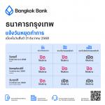 ทั้งนี้ในช่วงวันหยุดเทศกาลปีใหม่ วันที่ 31 ธันวาคม 2568 ลูกค้าสามารถใช้บริการทางการเงินของธนาคารกรุงเทพได้ ณ สาขาไมโครในห้างสรรพสินค้า และในวันที่ 2 มกราคม 2569 ณ สาขาในห้างสรรพสินค้า และสาขาไมโครในห้างสรรพสินค้า (ตรวจสอบรายชื่อสาขาที่เปิดให้บริการได้ที่ เว็บไซต์ www.bangkokbank.com) รวมถึงบริการตัวแทนธนาคารที่รองรับธุรกรรมในการฝาก-ถอนเงินสดและยืนยันตัวตน โดยมีจุดให้บริการรวม 162,000 แห่งทั่วประเทศ ซึ่งเปิดให้บริการตามปกติทุกวัน ณ จุดบริการต่างๆ ดังนี้