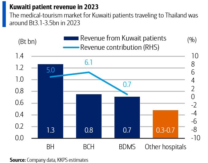 สำหรับผู้ป่วยต่างชาติ KKPS มองว่ามีโอกาสฟื้นตัวแรงกว่า เนื่องจากหลายปัจจัยเป็นเพียงเหตุการณ์ชั่วคราว ได้แก่ จำนวนผู้ป่วยจากคูเวตที่ลดลงในช่วงมกราคม-กุมภาพันธ์ เหตุแผ่นดินไหวในไทยในเดือนมีนาคม และจำนวนผู้ป่วยจากกัมพูชาที่ชะลอตั้งแต่ปลายเดือนพฤษภาคม ทั้งนี้ KKPS ยังเห็นการเติบโตระดับตัวเลขกลางหลักเดียวในผู้ป่วยตะวันออกกลาง แม้หักผลกระทบจากคูเวต ขณะที่ผู้ป่วยยุโรปยังโตแบบตัวเลขสองหลัก ดังนั้น KKPS จึงคาดว่าผู้ป่วยต่างชาติจะเติบโตได้ราว 8% ในปี 2026 โดยรวมแล้ว KKPS มองว่ากำไรภาคโรงพยาบาลคาดว่าจะฟื้นจาก 2% ในปี 2025 เป็น 9% ในปี 2026