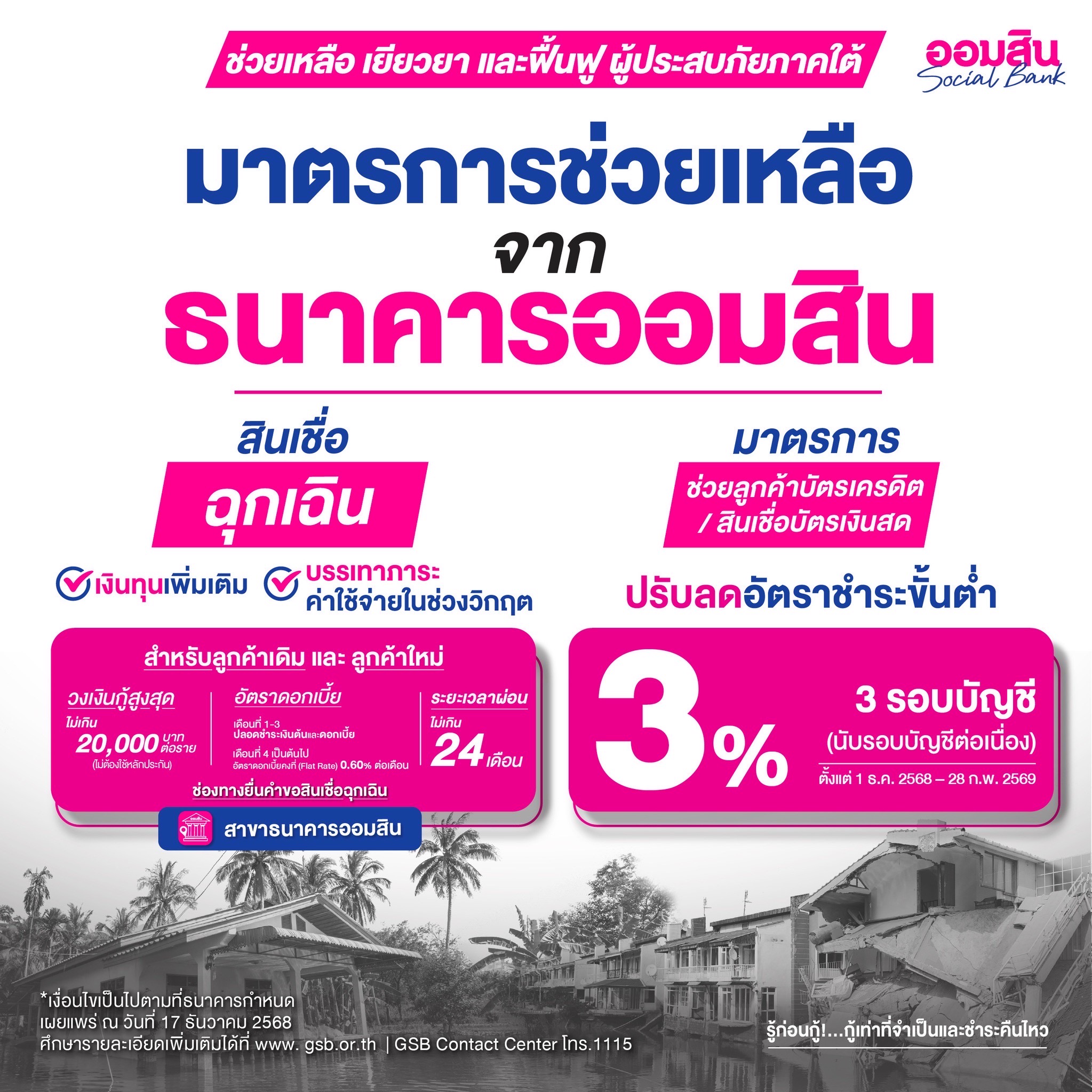 นางลภาวรรณ จันทร์กระจ่าง รองผู้อำนวยการธนาคารออมสิน รักษาการแทนผู้อำนวยการธนาคารออมสิน เปิดเผยว่า ตามมติคณะรัฐมนตรีเมื่อวันที่ 2 ธันวาคม 2568 เห็นชอบให้กระทรวงการคลังและสถาบันการเงินเฉพาะกิจเร่งออกมาตรการช่วยเหลือ เยียวยา ฟื้นฟูประชาชนที่ได้รับความเดือดร้อนจากอุทกภัยในพื้นที่ภาคใต้ตามประกาศของกรมป้องกันและบรรเทาสาธารณภัย (ปภ.) ธนาคารออมสินได้ออกชุดมาตรการทางการเงินที่ครอบคลุมกลุ่มลูกค้าเดิมและลูกค้าใหม่ ประกอบด้วย มาตรการพักชำระเงินต้นและไม่คิดดอกเบี้ย นาน 12 เดือน สำหรับลูกหนี้ที่มียอดหนี้ไม่เกิน 1 ล้านบาท ตามนโยบายรัฐ และจัดมาตรการเพิ่มเติมให้พักชำระเงินต้นและไม่คิดดอกเบี้ย นาน 3 เดือน สำหรับกลุ่มที่มียอดหนี้เกิน 1 ล้านบาท เพื่อหยุดภาระหนี้ทันทีในช่วงที่ยังต้องฟื้นฟูการดำรงชีพ พร้อมมาตรการสินเชื่ออัตราดอกเบี้ย 0% นาน 12 เดือน ช่วยประชาชนให้เข้าถึงแหล่งทุนในระบบสถาบันการเงินเพื่อเติมสภาพคล่องให้สามารถฟื้นตัวตั้งหลักได้โดยเร็ว