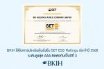 บริษัท บีเคไอ โฮลดิ้งส์ จำกัด (มหาชน) หรือ BKIH ได้รับผลการประเมินอยู่ในรายชื่อหุ้นยั่งยืนของตลาดหลักทรัพย์แห่งประเทศไทย (SET ESG Ratings) ประจำปี 2568 ในระดับ AAA ซึ่งเป็นระดับสูงสุดติดต่อกัน 3 ปีต่อเนื่อง ตั้งแต่ปี 2566 - 2568 อีกทั้งยังได้รับผลคะแนนรวมสูงกว่าค่าเฉลี่ยในกลุ่มอุตสาหกรรมธุรกิจการเงิน โดยการประเมินในภาพรวมการดำเนินงานของบริษัทฯ ตามกระบวนการขับเคลื่อนองค์กรสู่ความยั่งยืนในมิติสิ่งแวดล้อม สังคม และบรรษัทภิบาล (Environmental, Social and Governance หรือ ESG) รวมถึงมีคุณสมบัติของบริษัทจดทะเบียนตามที่ตลาดหลักทรัพย์ฯ กำหนด โดยผลการดำเนินงานด้าน ESG ของบีเคไอ โฮลดิ้งส์มีความโดดเด่นในการดำเนินธุรกิจที่ให้ความสำคัญกับความรับผิดชอบต่อสิ่งแวดล้อม สังคม ภายใต้การกำกับดูแลกิจการที่ดี รวมถึงมีการบริหารจัดการความเสี่ยงอย่างเหมาะสม ใช้กลยุทธ์ในการดำเนินงานอย่างสร้างสรรค์ โดยคำนึงถึงผลกระทบทั้งเชิงบวกและเชิงลบที่มีต่อผู้มีส่วนได้เสียทุกกลุ่มทั้งผู้ถือหุ้น ลูกค้า คู่ค้า พนักงาน หน่วยงานกำกับดูแล ตลอดจนสังคมและชุมชน เพื่อยืนหยัดการเติบโตทางธุรกิจอย่างมั่นคงและแข็งแกร่ง พร้อมยกระดับมาตรฐานองค์กรสู่ความยั่งยืนในระยะยาว
