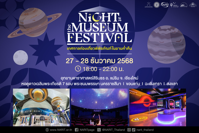 สถาบันวิจัยดาราศาสตร์แห่งชาติ (องค์การมหาชน) (สดร. หรือ NARIT) กระทรวงการอุดมศึกษา วิทยาศาสตร์ วิจัยและนวัตกรรม (อว.) ชวนเที่ยวนิทรรศการดาราศาสตร์ ท้องฟ้าจำลองรอบพิเศษยามค่ำคืน พร้อมกิจกรรมมากมายส่งท้ายเทศกาลคริสต์มาส และเพลิดเพลินกับการชมดาวเคล้าเสียงเพลง ใน "NARIT Night at the Museum 2025" วันที่ 27 - 28 ธันวาคม 2568 เวลา 10:00 - 22:00 น. ณ อุทยานดาราศาสตร์สิรินธร อ. แม่ริม จ. เชียงใหม่ และหอดูดาวภูมิภาคสำหรับประชาชนทั้ง 4 แห่ง ที่นครราชสีมา ขอนแก่น ฉะเชิงเทรา และสงขลา