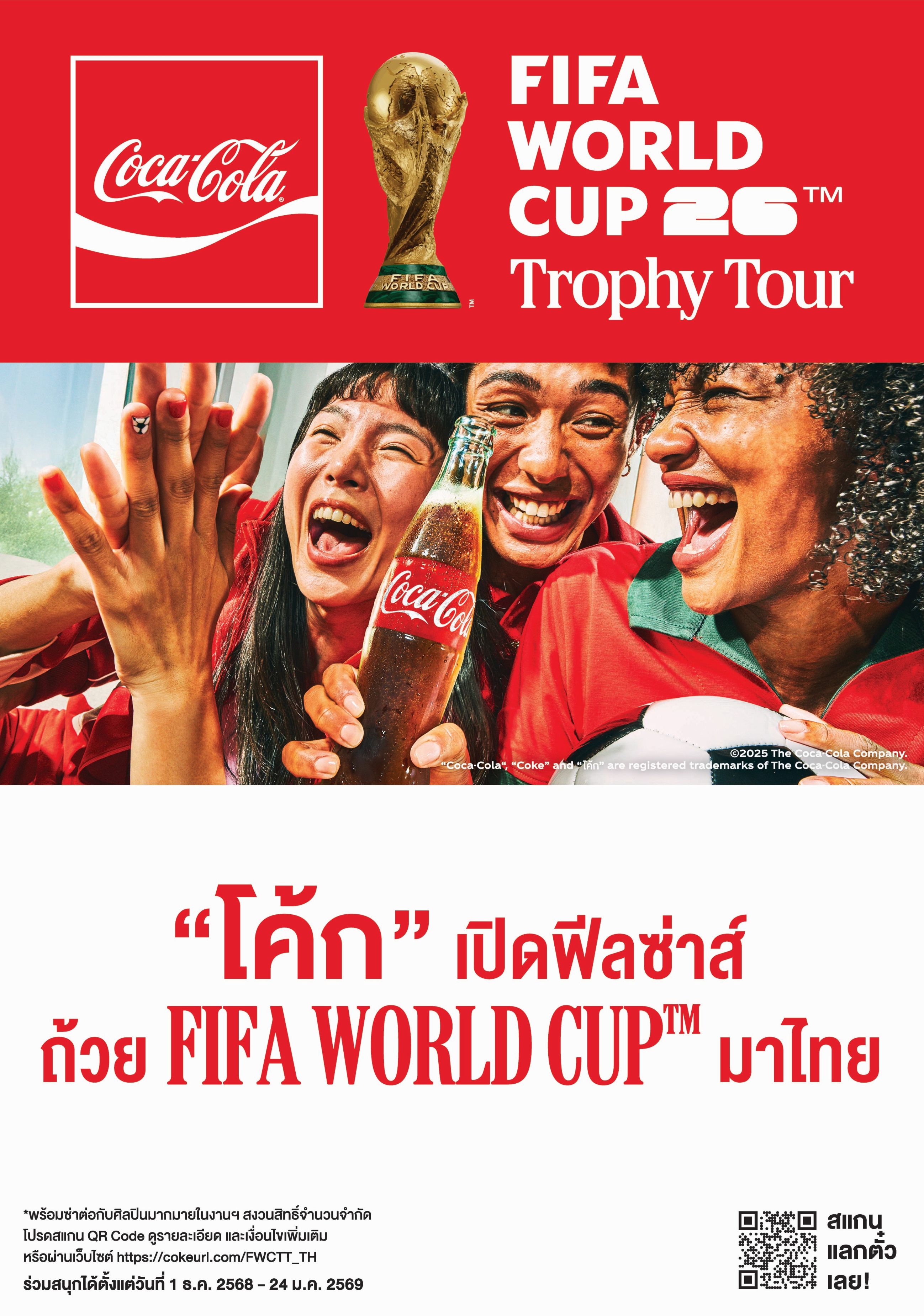 ผู้บริโภคสามารถรับสิทธิ์แลกรางวัลสุดซ่าส์ บัตรเข้าชมถ้วย FIFA World Cup™ Original Trophy อย่างใกล้ชิด เพียงซื้อ “โค้ก” หรือ “โค้ก ซีโร่” มูลค่าอย่างน้อย 99 บาท ต่อใบเสร็จ ในช่วงเวลาโปรโมชั่นตั้งแต่วันที่ 1 ธันวาคม 2568 ถึง 24 มกราคม 2569 จากนั้นอัปโหลดใบเสร็จเพื่อรับสิทธิ์แลกบัตรเข้างานที่แพลตฟอร์มของแคมเปญ https://cokeurl.com/FWCTT_TH สิทธิ์มีจำนวนจำกัดเพียง 12,000 ท่านแรกที่ลงทะเบียนสำเร็จเท่านั้น แฟนฟุตบอลตัวจริงต้องไม่พลาด