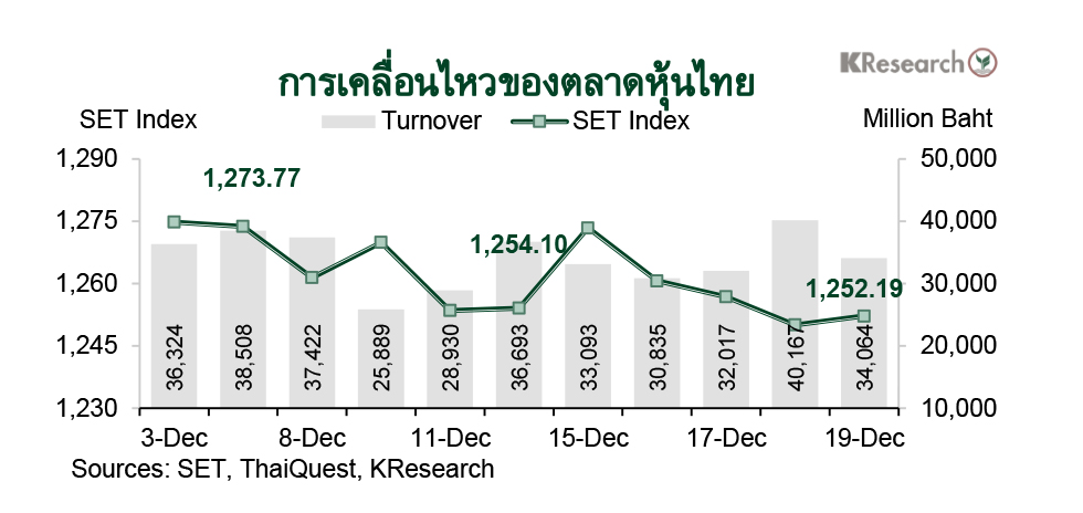 • ในวันศุกร์ที่ 19 ธ.ค. 2568 ดัชนี SET ปิดที่ระดับ 1,252.19 จุด ลดลง 0.15% จากระดับปลายสัปดาห์ก่อน ขณะที่มูลค่าการซื้อขายเฉลี่ยต่อวันอยู่ที่ 34,035.41 ล้านบาท เพิ่มขึ้น 5.59% จากสัปดาห์ก่อน ส่วนดัชนี mai เพิ่มขึ้น 0.57% มาปิดที่ระดับ 212.85 จุด