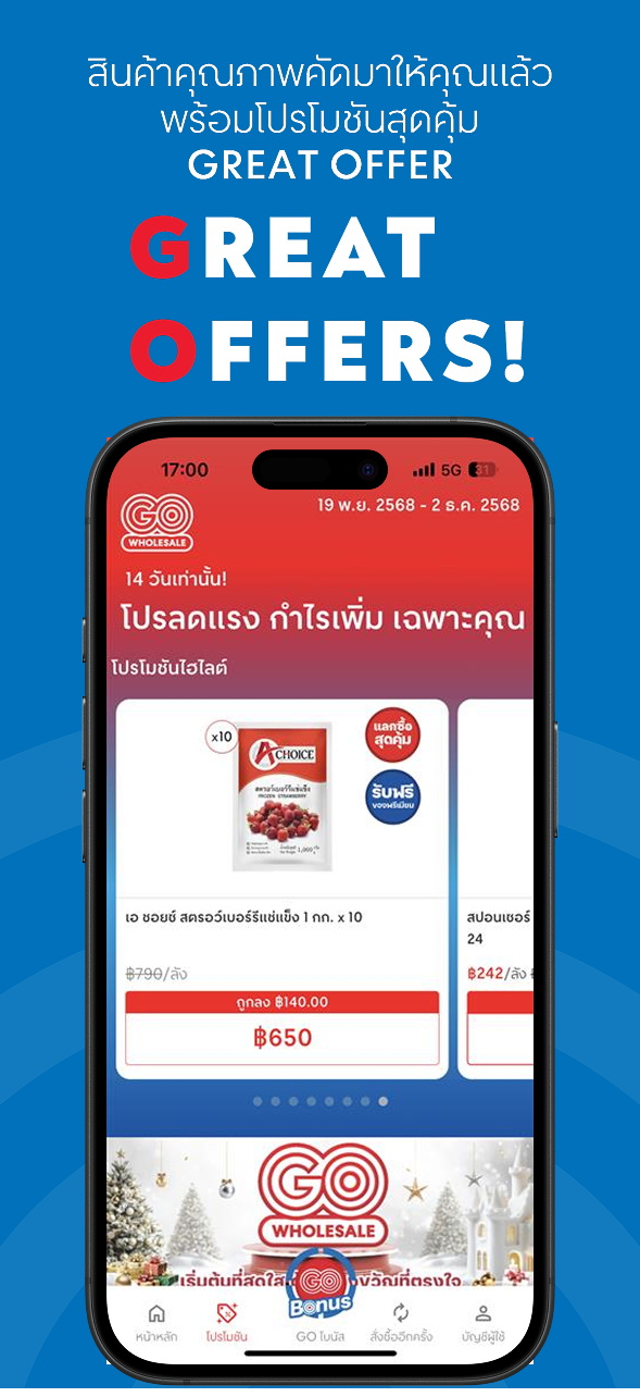 - รวมถึงในเดือนธันวาคม ลูกค้าสมาชิกยังสามารถลุ้นรับรางวัล กับแคมเปญ GO BONUS GO LUCKY บนแอปฯ GO WHOLESALE ในแบบดิจิทัล ลดปริมาณการใช้กระดาษแบบเดิม
