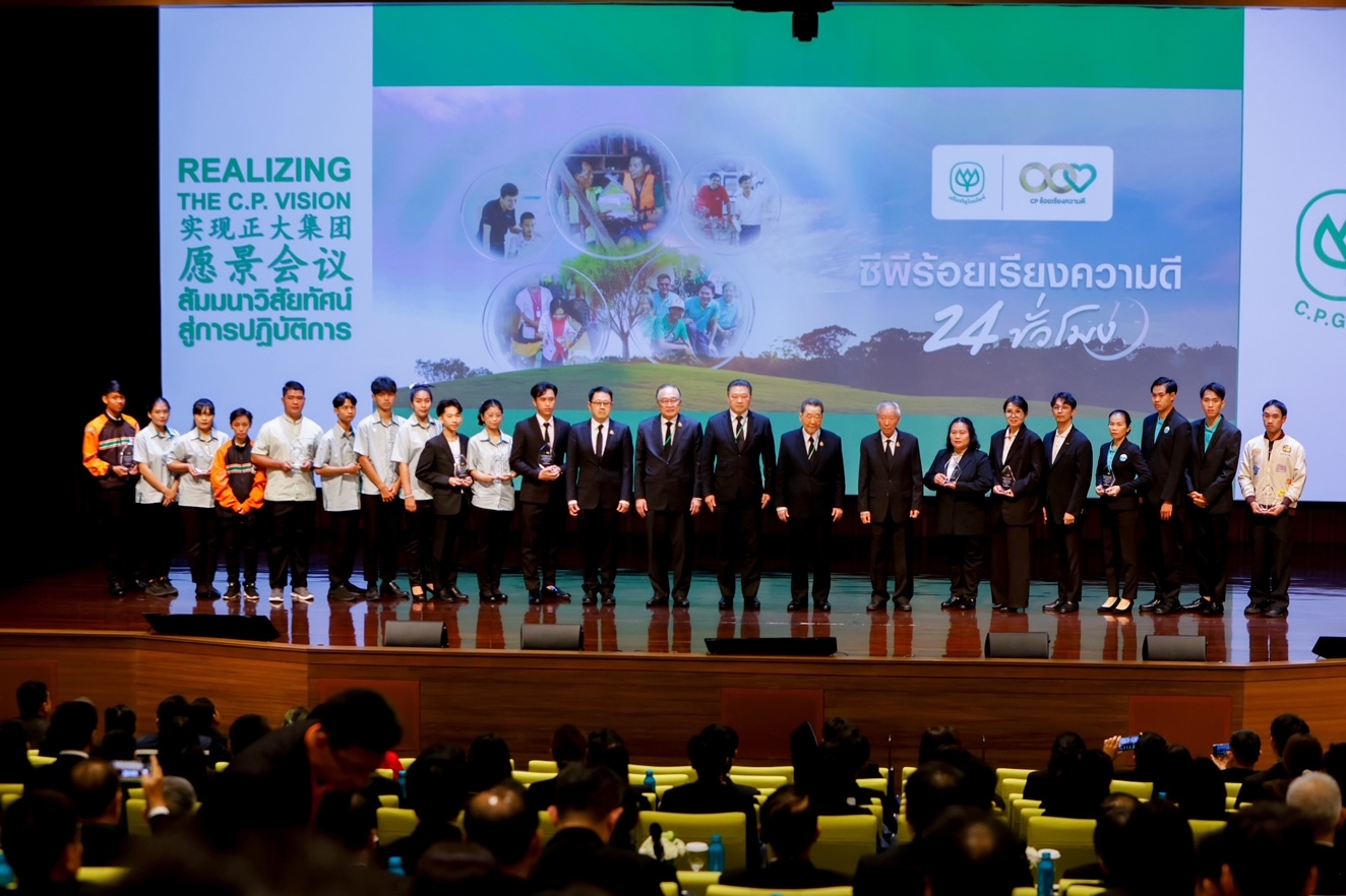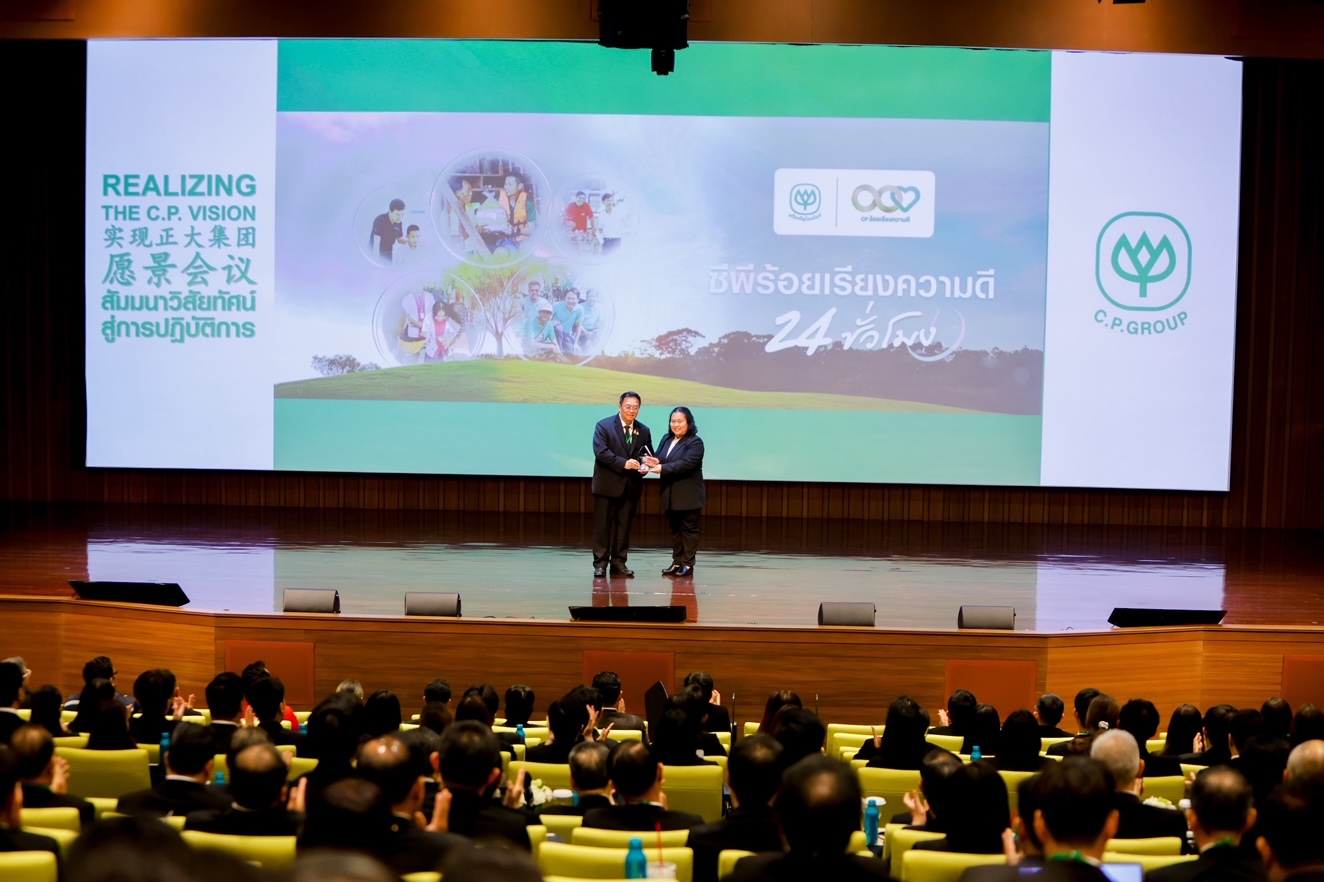 คุณสุภกิต เจียรวนนท์ ประธานกรรมการ เครือเจริญโภคภัณฑ์ พร้อมด้วย คุณปิยโชค ปิยางสุ รองกรรมการผู้จัดการอาวุโส บริษัท ซีพีแรม จำกัด ให้เกียรติมอบรางวัลและเชิดชูเกียรติพนักงานต้นแบบผู้ทำความดี ในโครงการ "ซีพีร้อยเรียงความดี 24 ชั่วโมง" ให้กับคุณสุรีรัตน์ ทองอู๋ ผู้จัดการแผนกบริหารภาพลักษณ์องค์กร สำนักยุทธศาสตร์ และคุณศิริพร ชินศรี ผู้จัดการแผนกธุรกรรมนำเข้าและส่งออก สำนักการตลาด Modern Trade & Export บริษัท ซีพีแรม จำกัด เพื่อยกย่องบุคลากรผู้สร้างคุณงามความดีให้ประจักษ์แก่สังคม ถ่ายทอดแรงบันดาลใจ และสะท้อนสปิริตของชาวซีพีที่มุ่งมั่น “คิดดี ทำดี” ควบคู่การทำงานอย่างมีความรับผิดชอบ ณ สถาบันผู้นำเครือเจริญโภคภัณฑ์ อำเภอปากช่อง จังหวัดนครราชสีมา