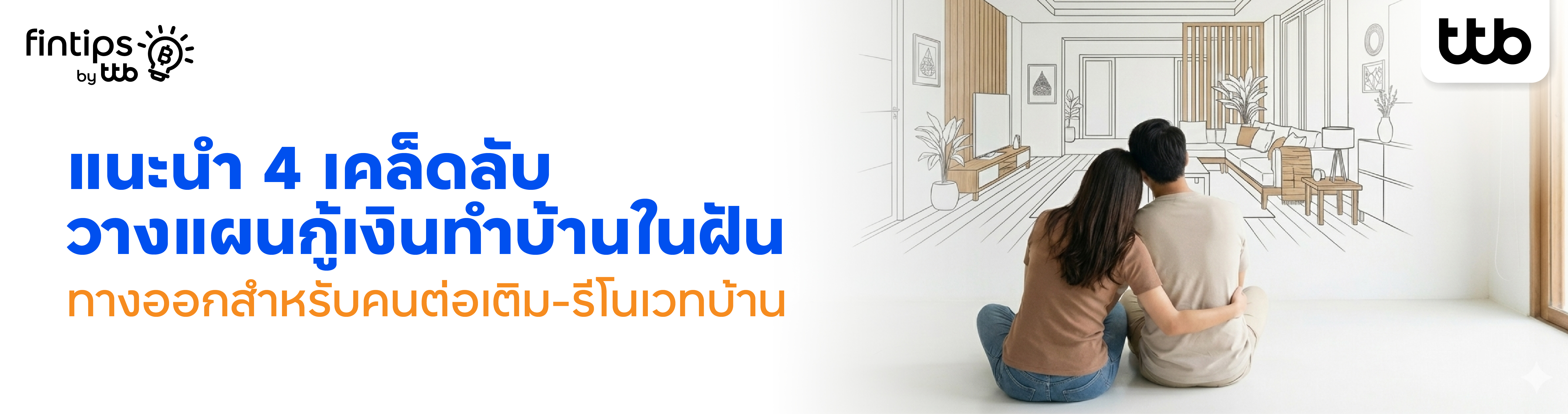 บ้านทุกหลังย่อมมีการเสื่อมสภาพตามกาลเวลา การซ่อมแซมหรือต่อเติมบ้านเป็นเรื่องใหญ่ที่ต้องใช้เงินก้อน การกู้เงินเพื่อรีโนเวทจึงเป็นตัวช่วยสำคัญที่จะทำให้บ้านสวยตามที่ตั้งไว้และการเงินไม่สะดุดไปพร้อมกัน วันนี้ fintips by ttb #เรื่องเงินที่รู้จริงแบบเพื่อนที่รู้ใจ เปิด 4 เคล็ดลับสำคัญ ที่จะช่วยให้คุณวางแผนการเงินและกู้เงินเพื่อบ้านในฝันได้อย่างราบรื่น!