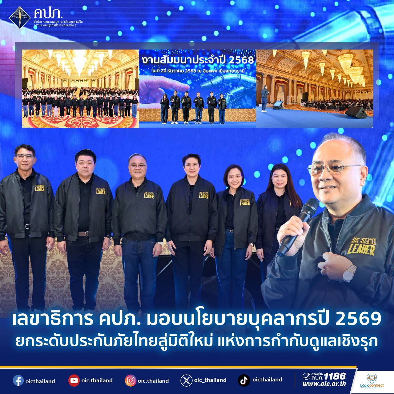 นายชูฉัตร ประมูลผล เลขาธิการคณะกรรมการกำกับและส่งเสริมการประกอบธุรกิจประกันภัย (เลขาธิการ คปภ.) เป็นประธานเปิดงานสัมมนาบุคลากร ประจำปี 2568 พร้อมมอบนโยบายและทิศทางการดำเนินงานของสำนักงานคณะกรรมการกำกับและส่งเสริมการประกอบธุรกิจประกันภัย (สำนักงาน คปภ.) ประจำปี 2569 ภายใต้แนวคิด “ยกระดับประกันภัยไทยสู่มิติใหม่แห่งการกำกับดูแลเชิงรุก จากวิกฤตสู่ความแข็งแกร่ง” โดยมีผู้บริหารระดับสูงและบุคลากรสำนักงาน คปภ. เข้าร่วมอย่างพร้อมเพรียง เมื่อวันที่ 20 ธันวาคม 2568 ณ ห้องรอยัล จูบิลี่ บอลรูม อิมแพค เมืองทองธานี จังหวัดนนทบุรี