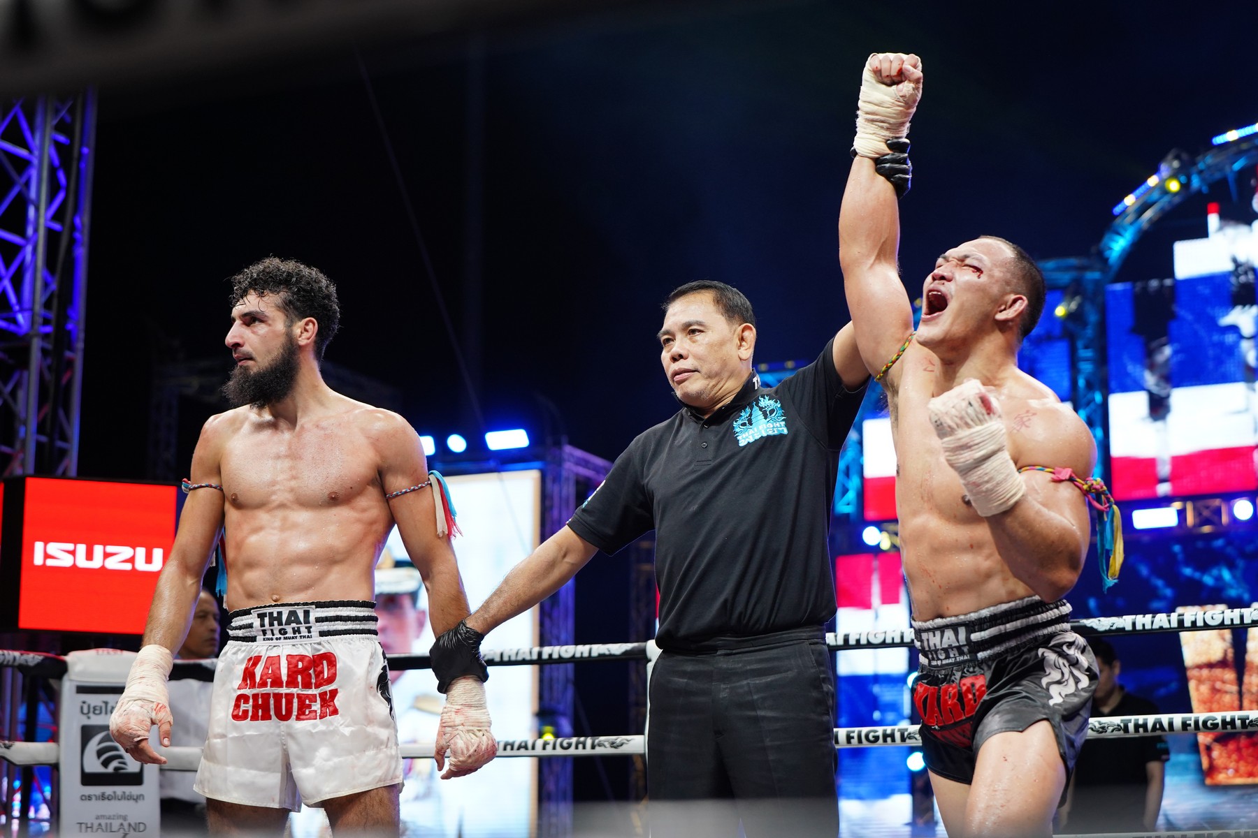 มร.ทาคาชิ ฮาตะ กรรมการผู้จัดการ บริษัท ตรีเพชรอีซูซุเซลส์ จำกัด กล่าวว่า “ขอแสดงความยินดีกับ จรวดศึก และ เขี้ยวเพชร ที่คว้าแชมป์ THAI FIGHT 2025 มาครองได้อย่างสง่างาม ด้วยหัวใจนักสู้ที่แข็งแกร่งจนได้รับพระราชทานถ้วยรางวัลอันทรงเกียรติ ซึ่งถือเป็นความสำเร็จอันน่าภาคภูมิใจในอาชีพนักชก ผมขออวยพรให้ทั้งสองท่านประสบความสำเร็จยิ่งขึ้นไปในอนาคต พร้อมกันนี้ ขอขอบคุณผู้ชมทุกท่านที่ให้การสนับสนุนรถอีซูซุ รายการ Isuzu Thailand Championship และ THAI FIGHT ด้วยดีเสมอมา ทุกแรงใจของท่านคือพลังสำคัญที่ขับเคลื่อนให้อีซูซุมุ่งมั่นพัฒนาอย่างไม่หยุดยั้ง และเราหวังเป็นอย่างยิ่งว่าจะได้รับความไว้วางใจจากทุกท่านเช่นนี้ตลอดไป”