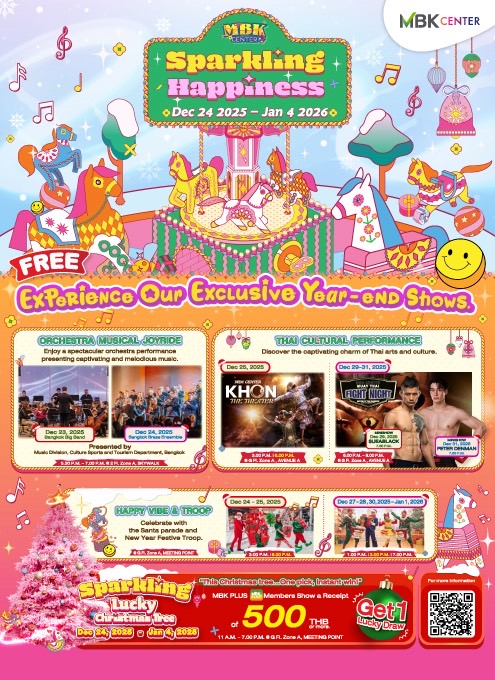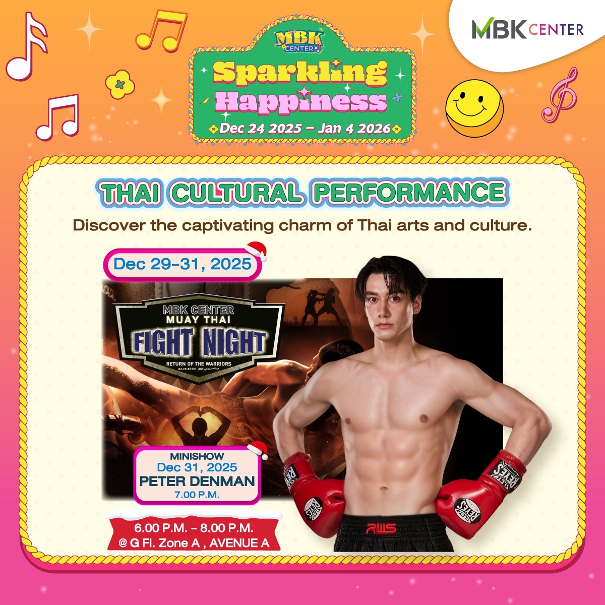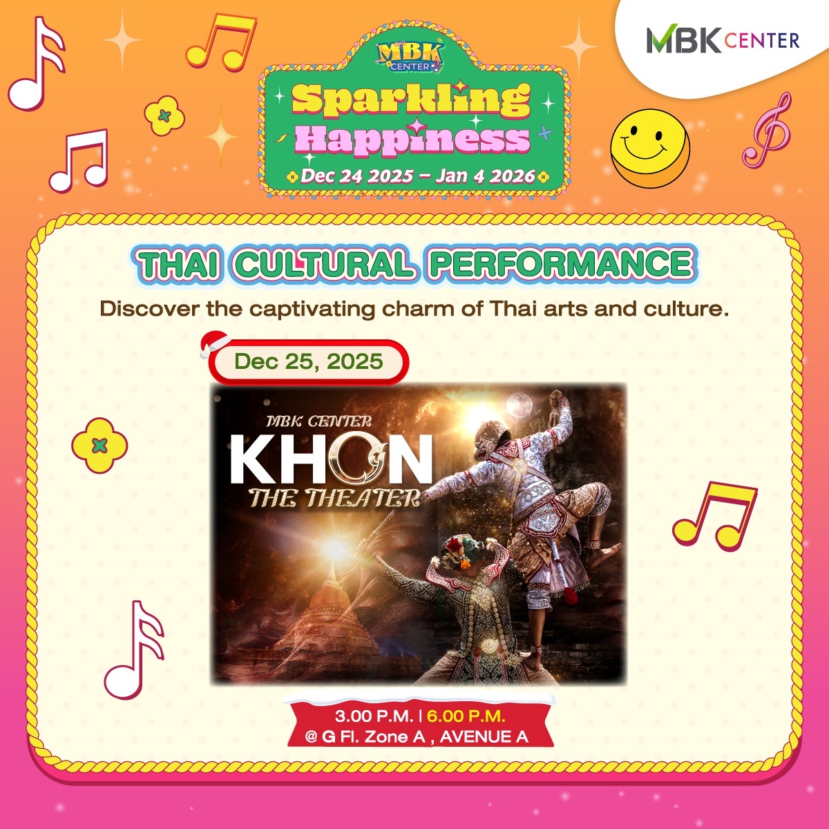 เพิ่มสีสันสร้างบรรยากาศการเฉลิมฉลองส่งท้ายปีเก่าต้อนรับปีใหม่ด้วยขบวนทรูป ระหว่างวันที่ 27-28 ธันวาคม 2568 และ 30 ธันวาคม 2568 – 1 มกราคม 2569 ในเวลา 13.00 น. 15.00 น. และ 19.00 น. ส่วนบริเวณลานกิจกรรมเอ็ม บี เค อเวนิว โซน A เชิญชมการแสดง “โขน” สุดตระการตาในวันที่ 25 ธันวาคม 2568 เวลา 15.00 น. และ 18.00 น. นอกจากนี้สายสปอร์ตไม่ควรพลาดกับ MBK Center Muay Thai Fight Night ชมลีลาแม่ไม้มวยไทยโชว์แบบจัดเต็ม 3 วันติด ตั้งแต่วันที่ 29-31 ธันวาคม 2568 เวลา 19.00 น.