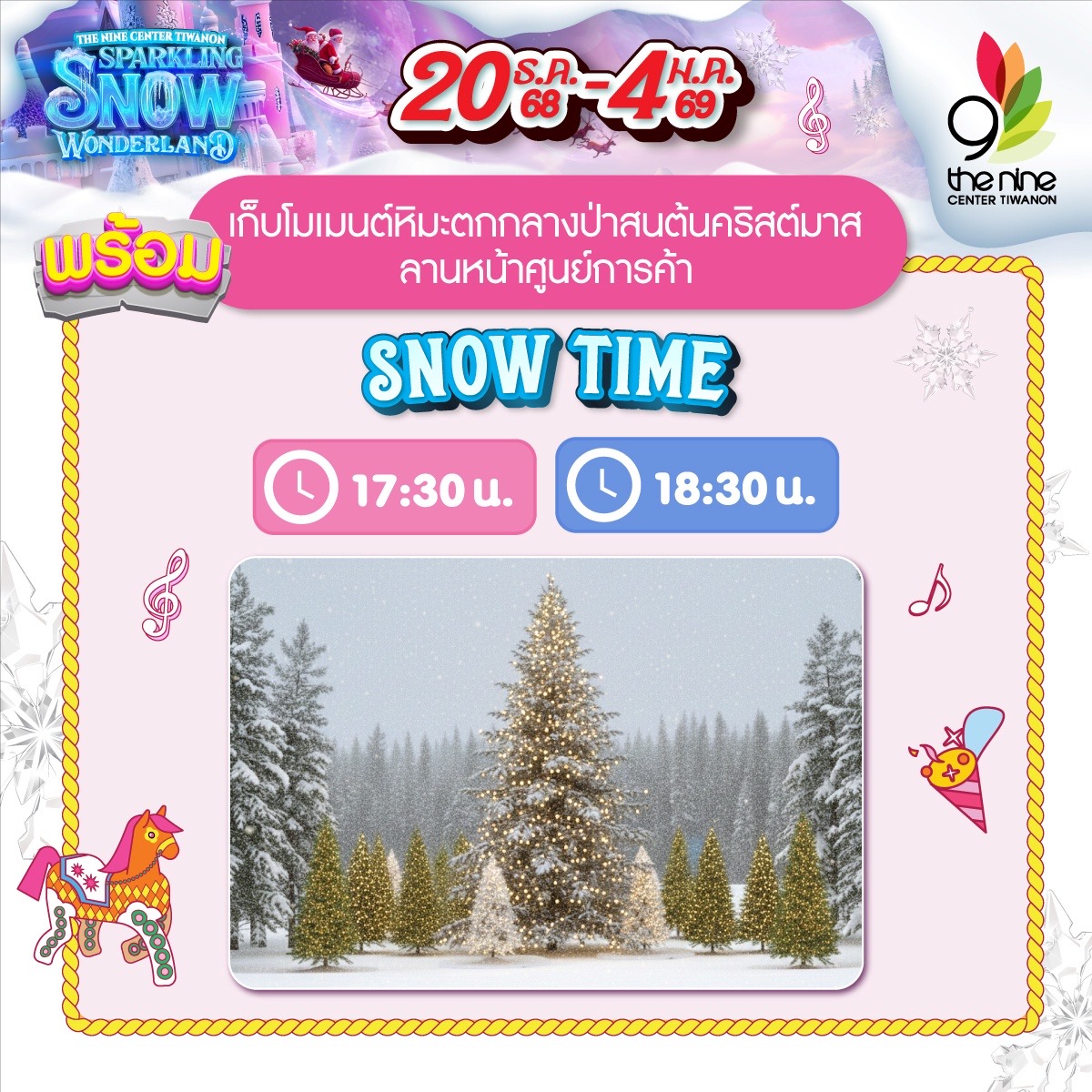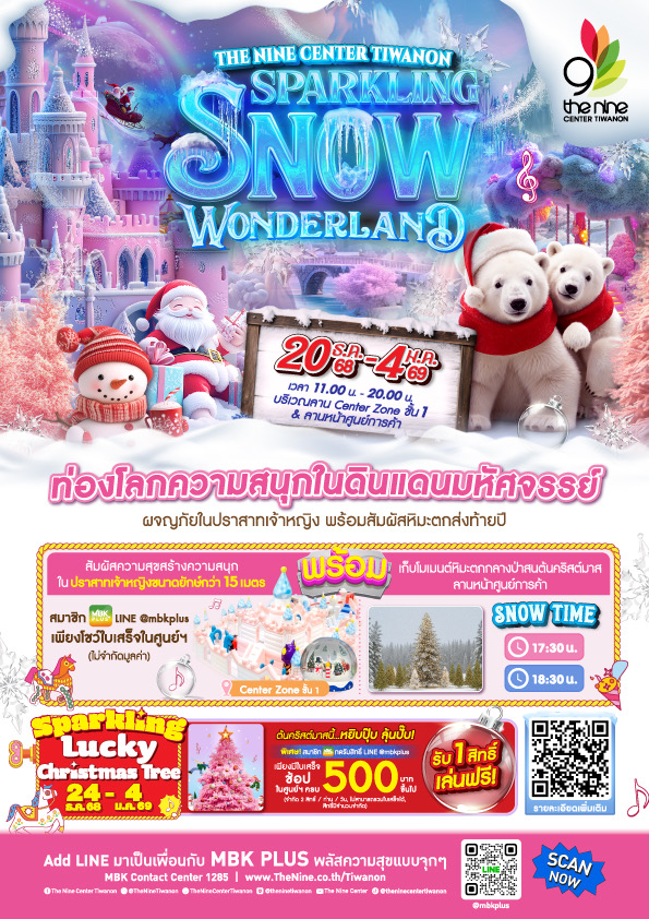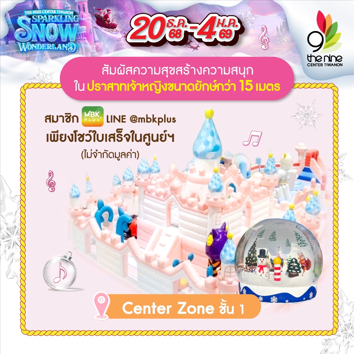 ชาวปทุมธานีชวนมาร่วมเก็บโมเมนต์ความประทับใจกับต้นคริสต์มาส กิจกรรมความบันเทิงครบเครื่องได้ที่ เดอะไนน์ เซ็นเตอร์ ติวานนท์ เนรมิตพื้นที่ให้กลายเป็นโลกแห่งเทพนิยาย Sparkling Snow Wonderland ตั้งแต่วันนี้ – 4 มกราคม 2569 เวลา 11.00 น. – 20.00 น. ท่องโลกความสนุกในดินแดนมหัศจรรย์ ผจญภัยใน “ปราสาทเจ้าหญิง” ขนาดยักษ์กว่า 15 เมตร บริเวณ Center Zone ชั้น 1 สนุกได้ฟรี!! สำหรับสมาชิก MBK PLUS เพียงแสดงใบเสร็จช้อป - อิ่ม ในศูนย์ฯ (ไม่จำกัดมูลค่า) ถ่ายรูปสุดฟินกับซานตาคลอสยักษ์ หมีโพลาร์ขนาดใหญ่ Snow Globe ยักษ์สุดตระการตา พร้อมสัมผัสหิมะตกกลางป่าสนต้นคริสต์มาส เวลา 17.30 น. และ 18.30 น. ลานด้านหน้าศูนย์ฯ