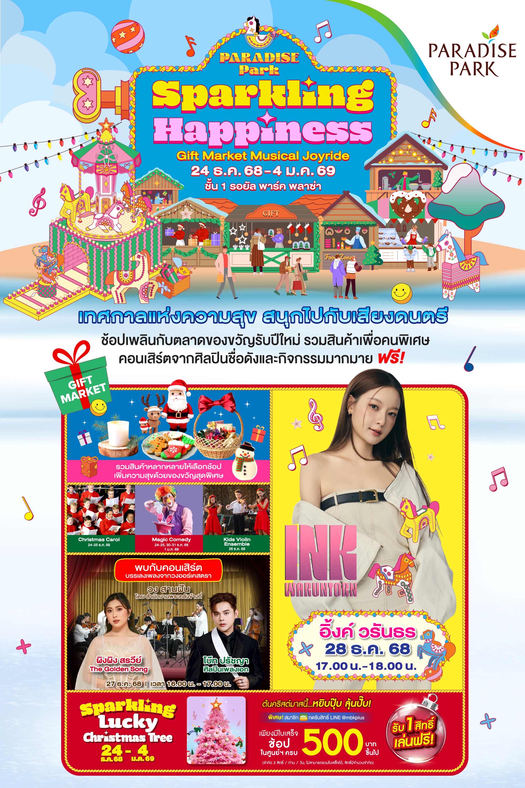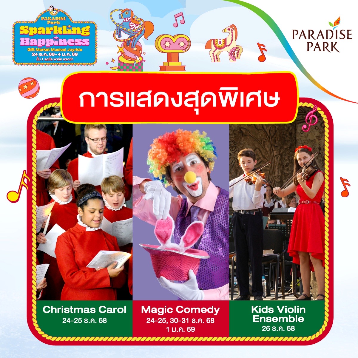 ด้านศูนย์การค้า “พาราไดซ์ พาร์ค” จัดกิจกรรม Paradise Park Sparkling Happiness Gift Market – Musical Joyride บริเวณ Royal Park Plaza ชั้น 1 ตั้งแต่วันนี้–4 มกราคม 2569 เทศกาลแห่งความสุข สนุกไปกับเสียงดนตรี ช้อปเพลินกับตลาดของขวัญต้อนรับปีใหม่ที่รวบรวมสินค้าเพื่อคนพิเศษ คอนเสิร์ตจากศิลปินชื่อดังและกิจกรรมมากมายในบรรยากาศอบอุ่น สนุก และเป็นกันเอง ชมฟรีตลอดงาน ดังนี้