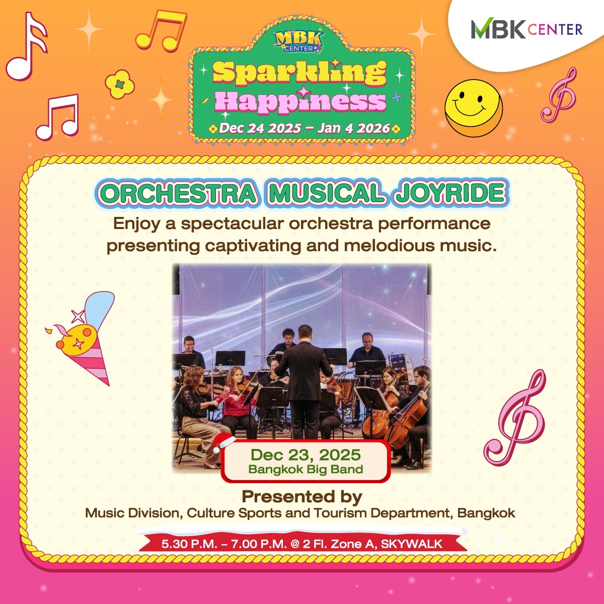 พร้อมอัดแน่นอีเวนต์ ศูนย์การค้าเอ็ม บี เค เซ็นเตอร์ เติมเต็มประสบการณ์เฉลิมฉลองส่งท้ายปีด้วยกิจกรรมสุดเอ็กซ์คลูซีฟ MBK Center Sparkling Happiness ตั้งแต่วันนี้ – 4 มกราคม 2569 พบกับความสุขที่เสิร์ฟให้ทุกวัน ทั้งการแสดง ดนตรี และ กิจกรรมลุ้นรางวัล เริ่มต้นความพิเศษด้วยการแสดงดนตรี ORCHESTRA MUSICAL JOYRIDE โดย สำนักวัฒนธรรม กีฬา และการท่องเที่ยว ที่จะมาบรรเลงบทเพลงแห่งความสุขในวันที่ 23-24 ธันวาคม 2568 เวลา 17.30 น. – 19.00 น. บริเวณ Sky Walk ต่อด้วยบรรยากาศคริสต์มาสสุดอบอุ่นกับ Christmas Carol วันที่ 24-25 ธันวาคม 2568 ในเวลา 15.00 น. และ 18.00 น. พร้อมเซอร์ไพรส์พิเศษ วันที่ 25 ธันวาคม 2568 พบกับลุงซานต้าใจดีที่จะมาแจกของขวัญให้กับลูกค้าทุกท่าน