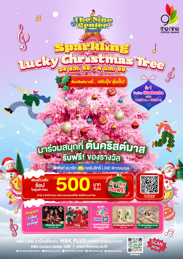 ช้อปสนุกกับศูนย์การค้าในเครือเอ็ม บี เค แจกรางวัลจัดเต็มข้ามปีให้ได้ลุ้นของขวัญกับกิจกรรม สอยดาวต้นคริสต์มาส Sparking Lucky Christmas Tree เพียงแสดงใบเสร็จช้อปหรืออิ่มในศูนย์ฯ มูลค่า 500 บาทขึ้นไป รับ 1 สิทธิ์ ลุ้นของขวัญฟรีทันที ตั้งแต่วันนี้ - 4 มกราคม 2569 (จำกัด 2 สิทธิ์/ท่าน/วัน) โดยต้นคริสต์มาส Sparking Lucky Christmas Tree ของ ศูนย์การค้าเอ็ม บี เค เซ็นเตอร์ ตั้งอยู่ที่ Meeting Point ชั้น G โซน A, พาราไดซ์ พาร์ค อยู่ที่ชั้น 1ด้านหน้ารอยัล พาร์ค พลาซ่า, เดอะไนน์ เซ็นเตอร์ พระราม 9 อยู่ที่ชั้น 1 (ข้าง Starbucks) และ เดอะไนน์ เซ็นเตอร์ ติวานนท์ อยู่ที่ชั้น 1 ลาน Center Zone