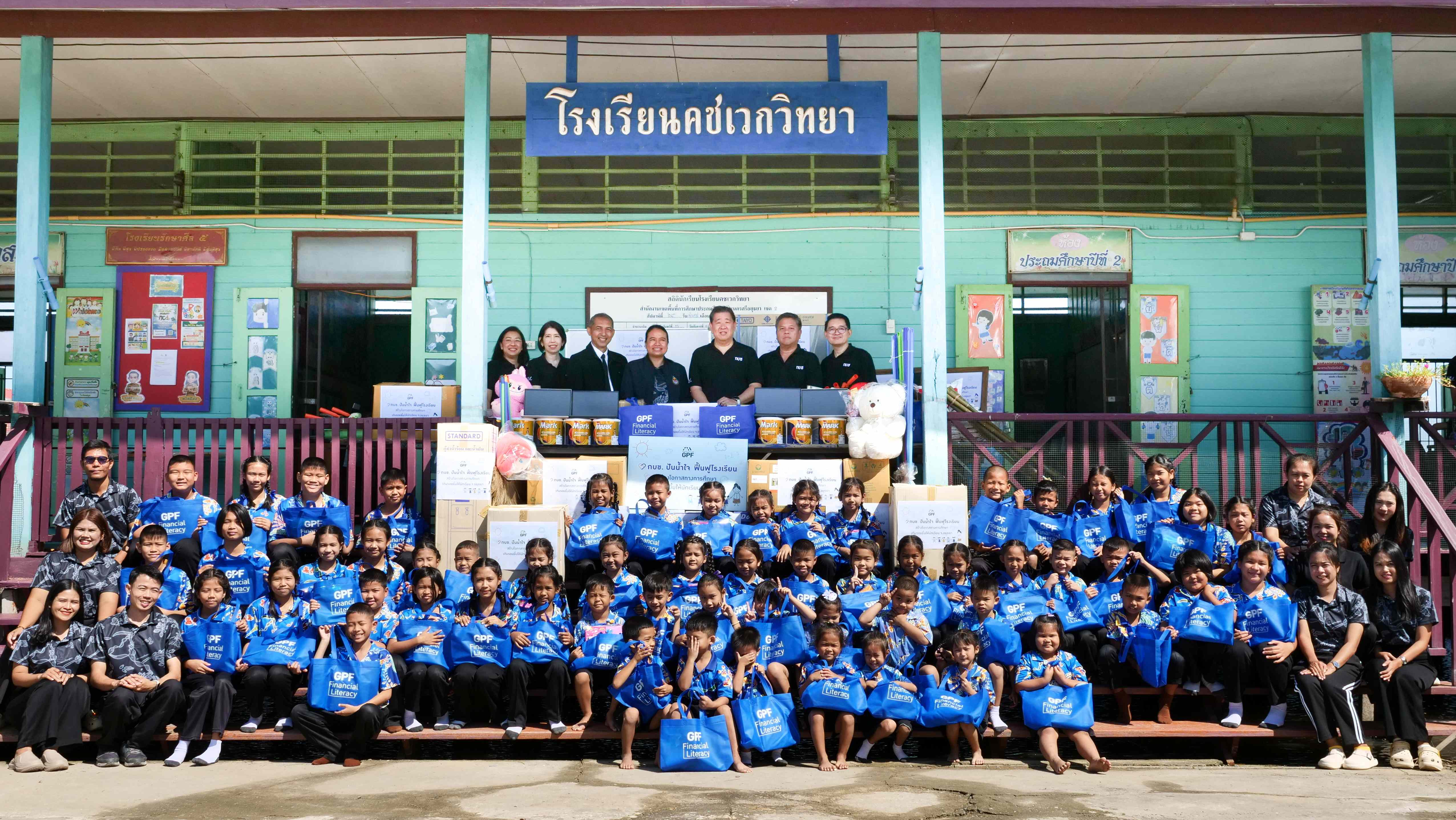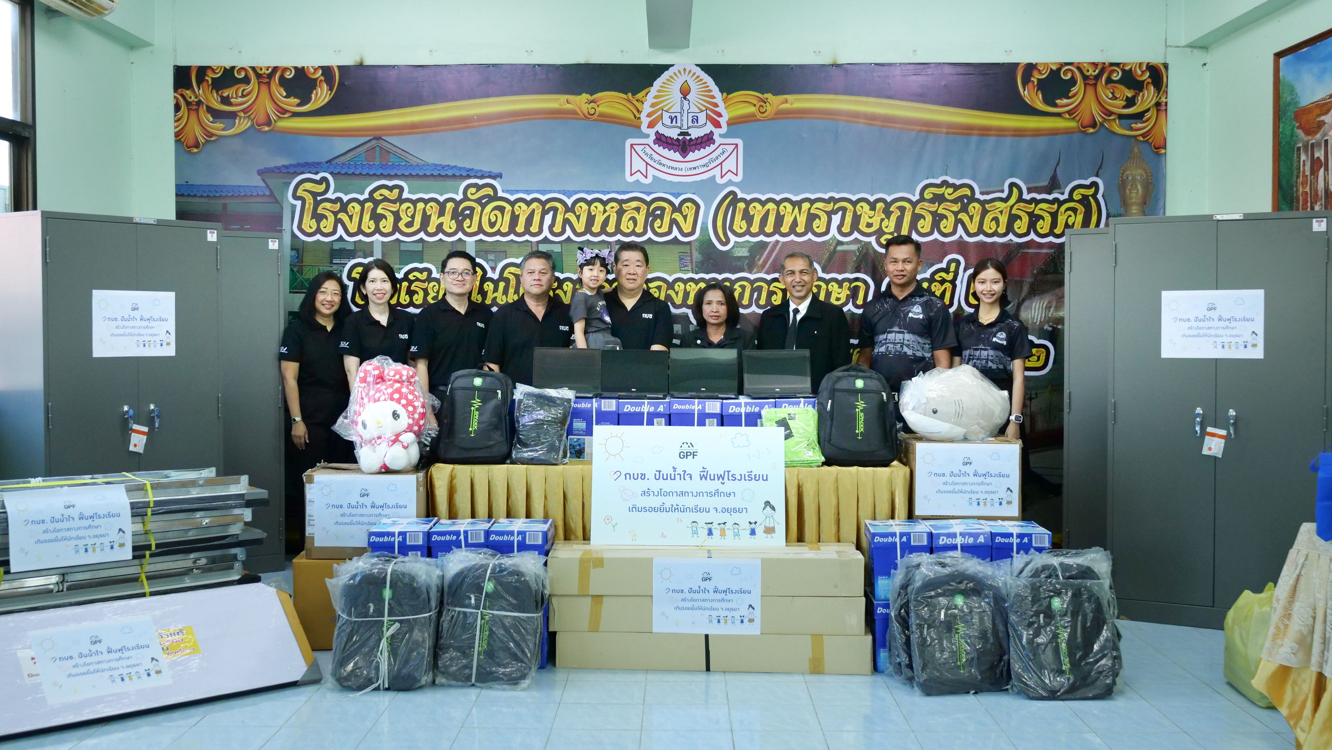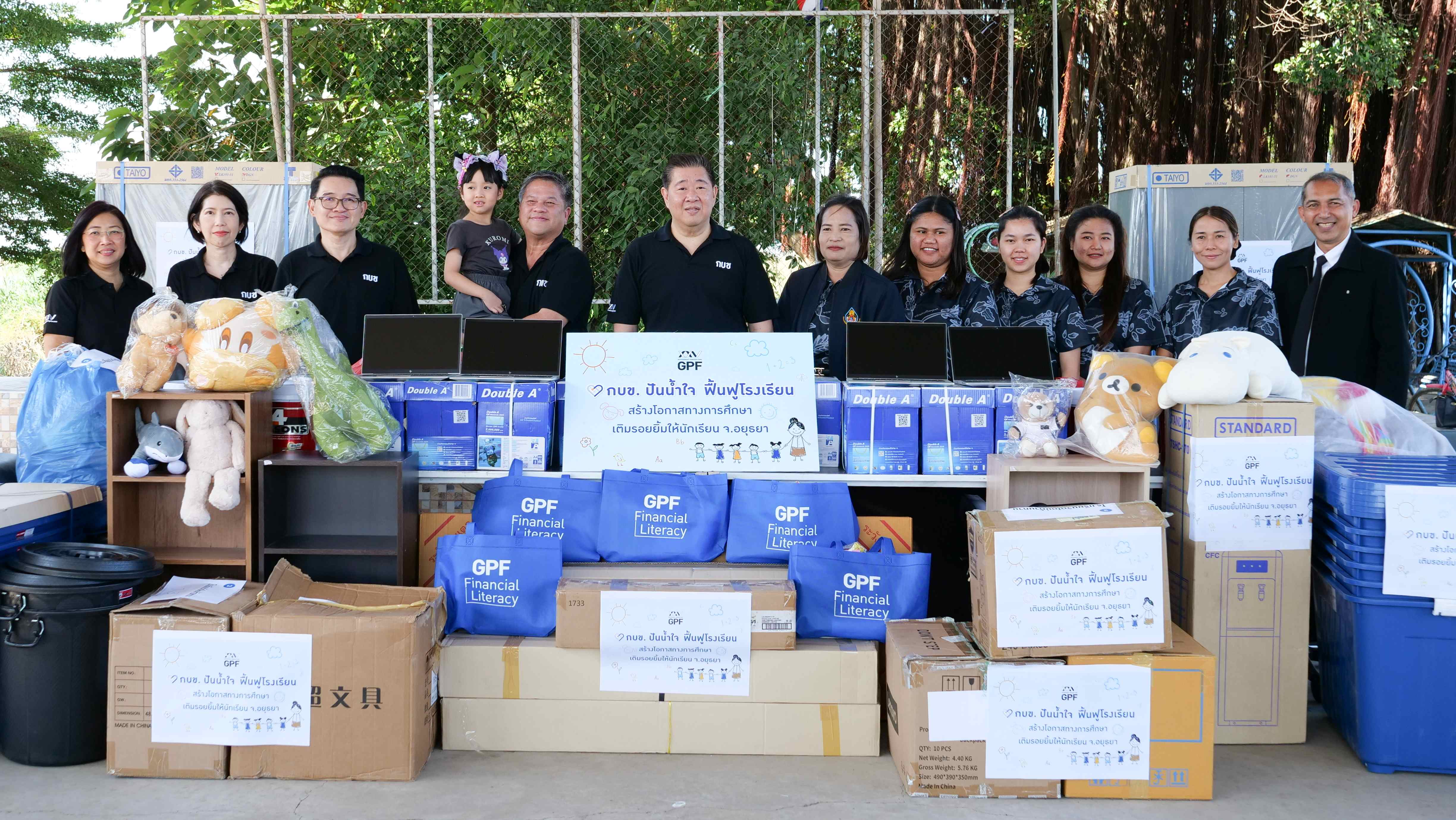 โดยโรงเรียนทั้ง 4 แห่งได้รับผลกระทบจากเหตุการณ์น้ำท่วมในพื้นที่จังหวัดพระนครศรีอยุธยา ทำให้มีความต้องการการสนับสนุนเพื่อซ่อมแซมและปรับปรุงสภาพแวดล้อมการเรียนรู้ให้กลับมาพร้อมใช้งานซึ่ง กบข. ได้จัดเตรียมสิ่งของที่จำเป็นและตามความต้องการของโรงเรียน อาทิ อุปกรณ์ซ่อมแซมและปรับปรุงอาคาร อุปกรณ์การเรียนการสอน อุปกรณ์กีฬาและเครื่องแต่งกาย เป็นต้น นอกจากนี้ กบข. ยังได้เชิญชวนพนักงาน กบข. ร่วมบริจาคของเล่นและตุ๊กตา เพื่อเป็นการให้กำลังใจและสร้างรอยยิ้มให้แก่น้อง ๆ ในโรงเรียนที่ได้รับผลกระทบ