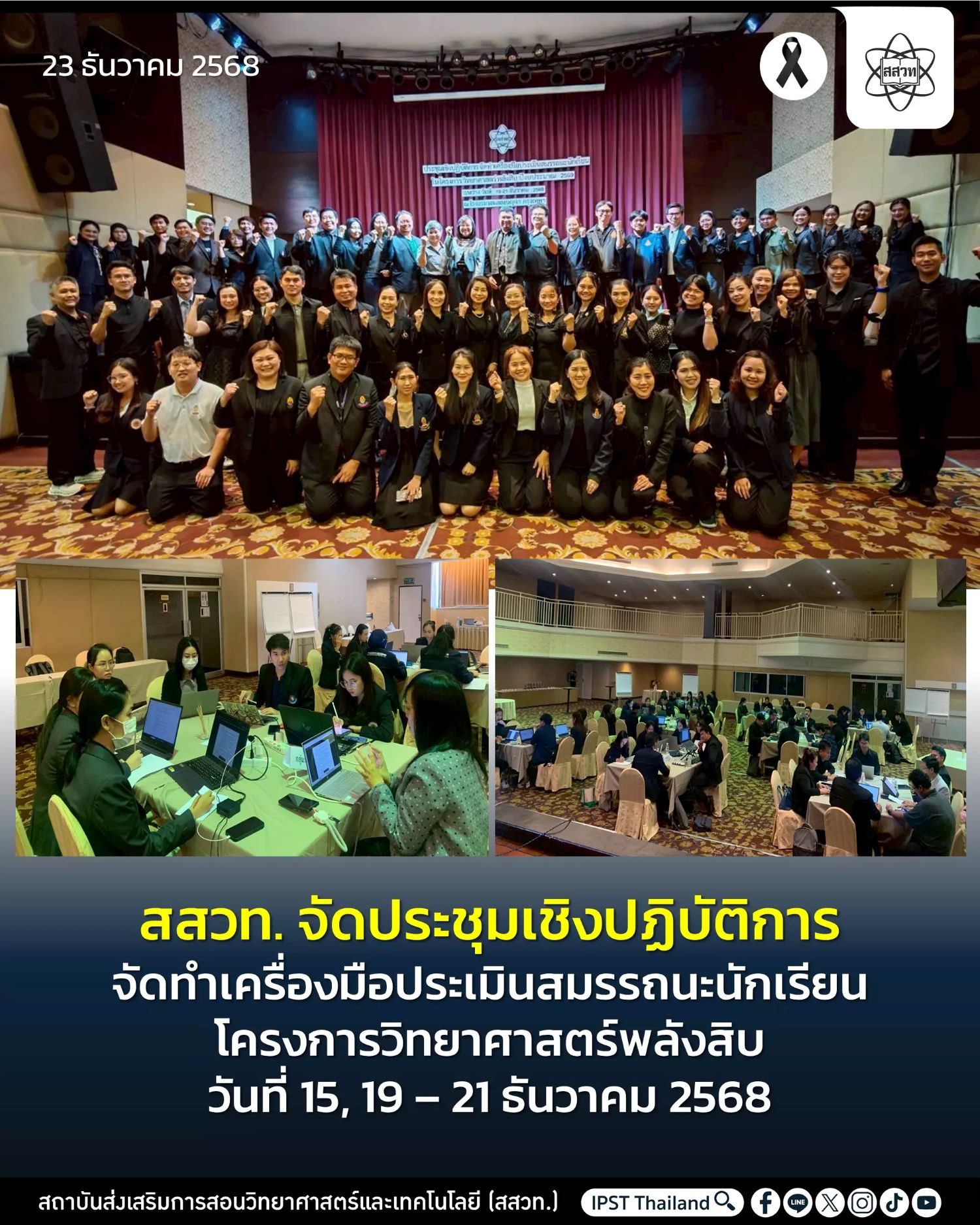 สถาบันส่งเสริมการสอนวิทยาศาสตร์และเทคโนโลยี (สสวท.) จัดการประชุมเชิงปฏิบัติการพัฒนาเครื่องมือประเมินสมรรถนะนักเรียนในโครงการวิทยาศาสตร์พลังสิบ ประจำปีงบประมาณ พ.ศ. 2569 ระหว่างวันที่ 15 และ 19-21 ธันวาคม 2568 ณ โรงแรมรอยัลเบญจา กรุงเทพมหานคร เพื่อมุ่งเน้นการยกระดับคุณภาพการจัดการเรียนรู้วิทยาศาสตร์ คณิตศาสตร์ และเทคโนโลยี รวมทั้งการพัฒนาสมรรถนะผู้เรียนให้สอดคล้องกับแนวคิดการจัดการเรียนรู้ฐานสมรรถนะ วันที่ 15 ธันวาคม เป็นการประชุมเตรียมความพร้อมคณะทำงาน พร้อมการบรรยายพิเศษด้านเทคนิคการประเมินสมรรถนะผู้เรียนและแนวทางการออกแบบเครื่องมือประเมินสมรรถนะ และระหว่างวันที่ 19 – 21 ธันวาคม เป็นการประชุมเชิงปฏิบัติการจัดทำแบบทดสอบวัดสมรรถนะทั้งสมรรถนะพื้นฐานตามหลักสูตรแกนกลางการศึกษาขั้นพื้นฐาน และสมรรถนะเฉพาะด้านวิทยาศาสตร์ รวมถึงการวางแผนการนำเครื่องมือไปใช้เก็บรวบรวมข้อมูลเชิงประจักษ์จากการจัดการเรียนรู้จริงในสถานศึกษา