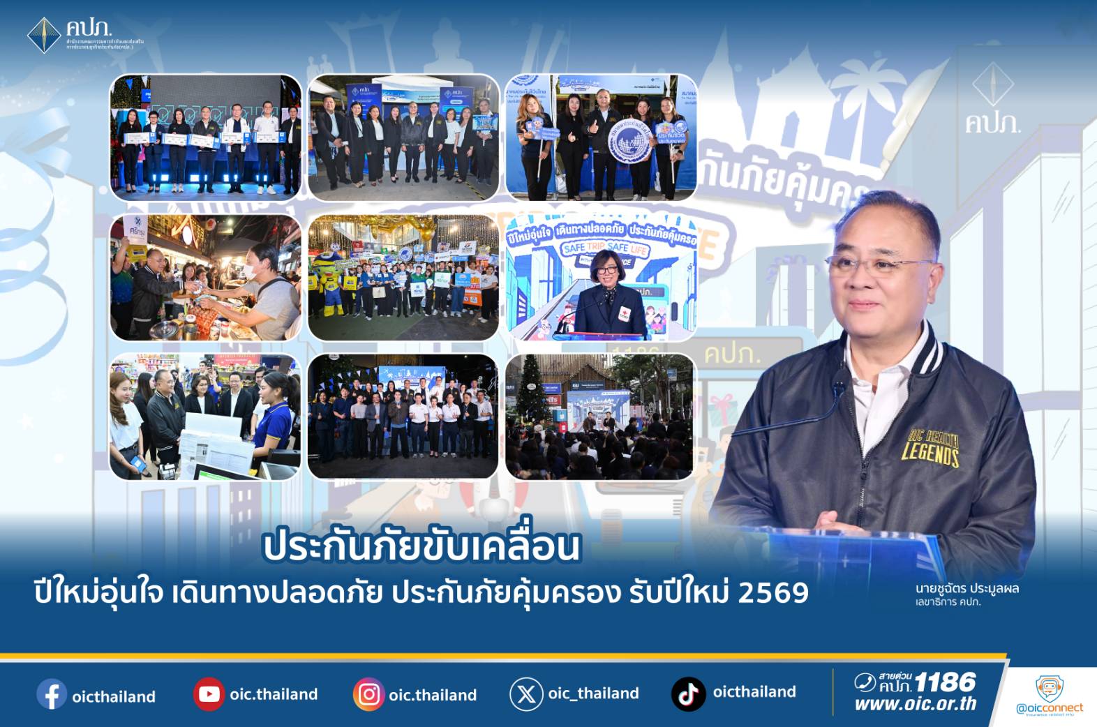 ในโอกาสเทศกาลปีใหม่ 2569 ที่กำลังจะมาถึงนี้ สำนักงาน คปภ. ขอส่งความปรารถนาดีไปยังประชาชนทุกคน ไม่ว่าจะเดินทางกลับภูมิลำเนา ท่องเที่ยว หรือใช้เวลาอยู่ร่วมกับครอบครัวและคนที่รัก ขอให้ทุกการเดินทางเป็นไปด้วยความปลอดภัย อุ่นใจ และมั่นใจ โดยมีการประกันภัยเป็นเครื่องมือสำคัญที่ช่วยบริหารความเสี่ยงในทุกเทศกาลสำคัญ เพื่อให้ช่วงเวลาดังกล่าวเป็นเทศกาลแห่งรอยยิ้มความอบอุ่น และความทรงจำที่ดีอย่างแท้จริง เลขาธิการ คปภ. กล่าวในตอนท้าย