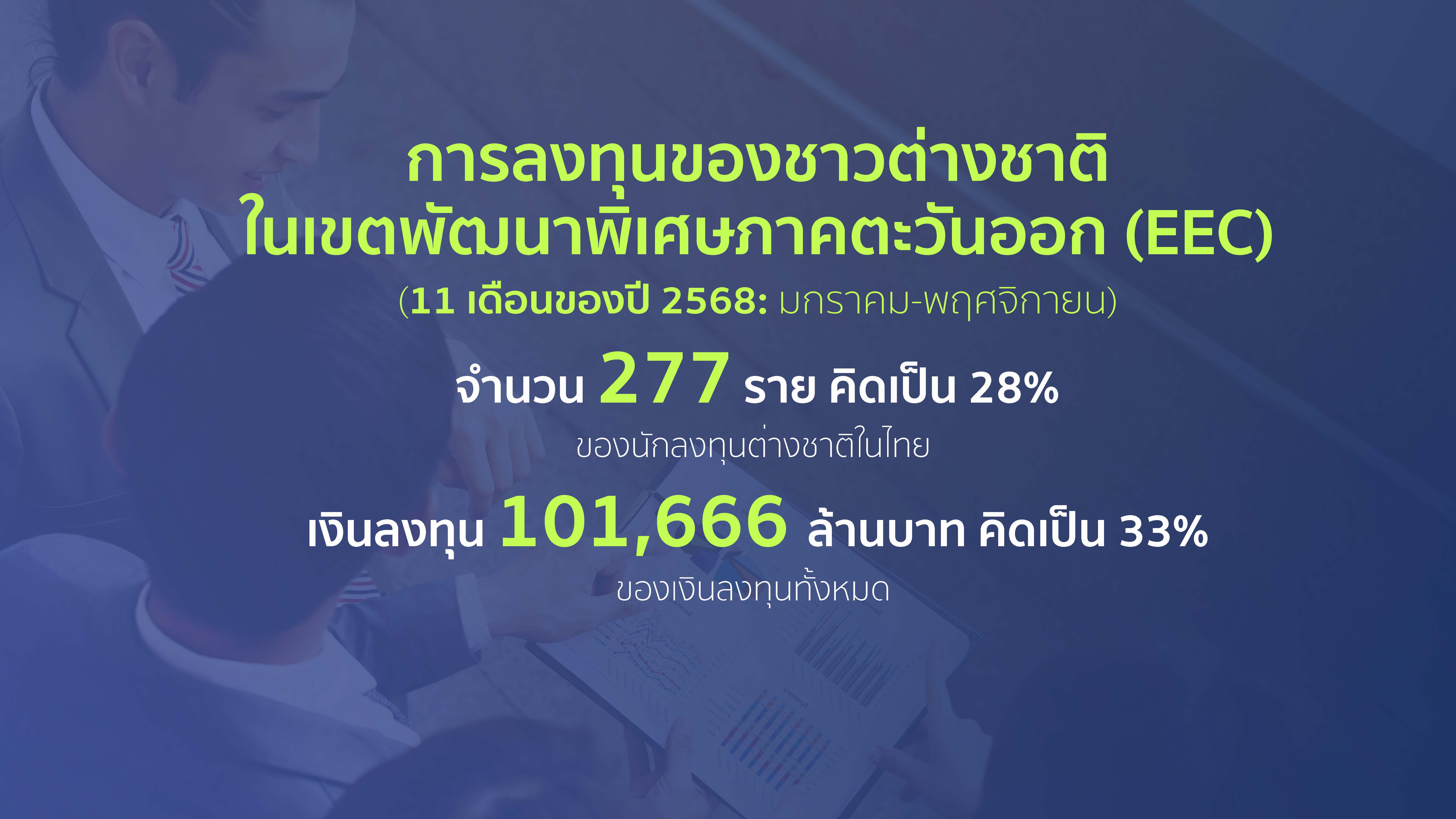 อธิบดีพูนพงษ์ฯ เพิ่มเติมว่า สำหรับการลงทุนในจังหวัดพื้นที่ EEC ของนักลงทุนต่างชาติ ช่วง 11 เดือนของปี 2568 (มกราคม - พฤศจิกายน) มีนักลงทุนต่างชาติสนใจลงทุนในพื้นที่ EEC 277 ราย คิดเป็น 28% ของจำนวนนักลงทุนต่างชาติในไทย ลดลงจากช่วงเวลาเดียวกันของปี 2567 จำนวน 4 ราย (1%) (เดือน ม.ค. - พ.ย. 68 ลงทุน 277 ราย / เดือน ม.ค. - พ.ย. 67 ลงทุน 281 ราย) โดยมีมูลค่าการลงทุนในจังหวัดพื้นที่ EEC 101,666 ล้านบาท คิดเป็น 33% ของเงินลงทุนทั้งหมด โดยเป็นนักลงทุนจาก *จีน 72 ราย ลงทุน 18,667 ล้านบาท *ญี่ปุ่น 60 ราย ลงทุน 32,349 ล้านบาท *สิงคโปร์ 40 ราย ลงทุน 22,705 ล้านบาท และประเทศอื่นๆ 105 ราย ลงทุน 27,945 ล้านบาท โดยธุรกิจที่ลงทุน อาทิ