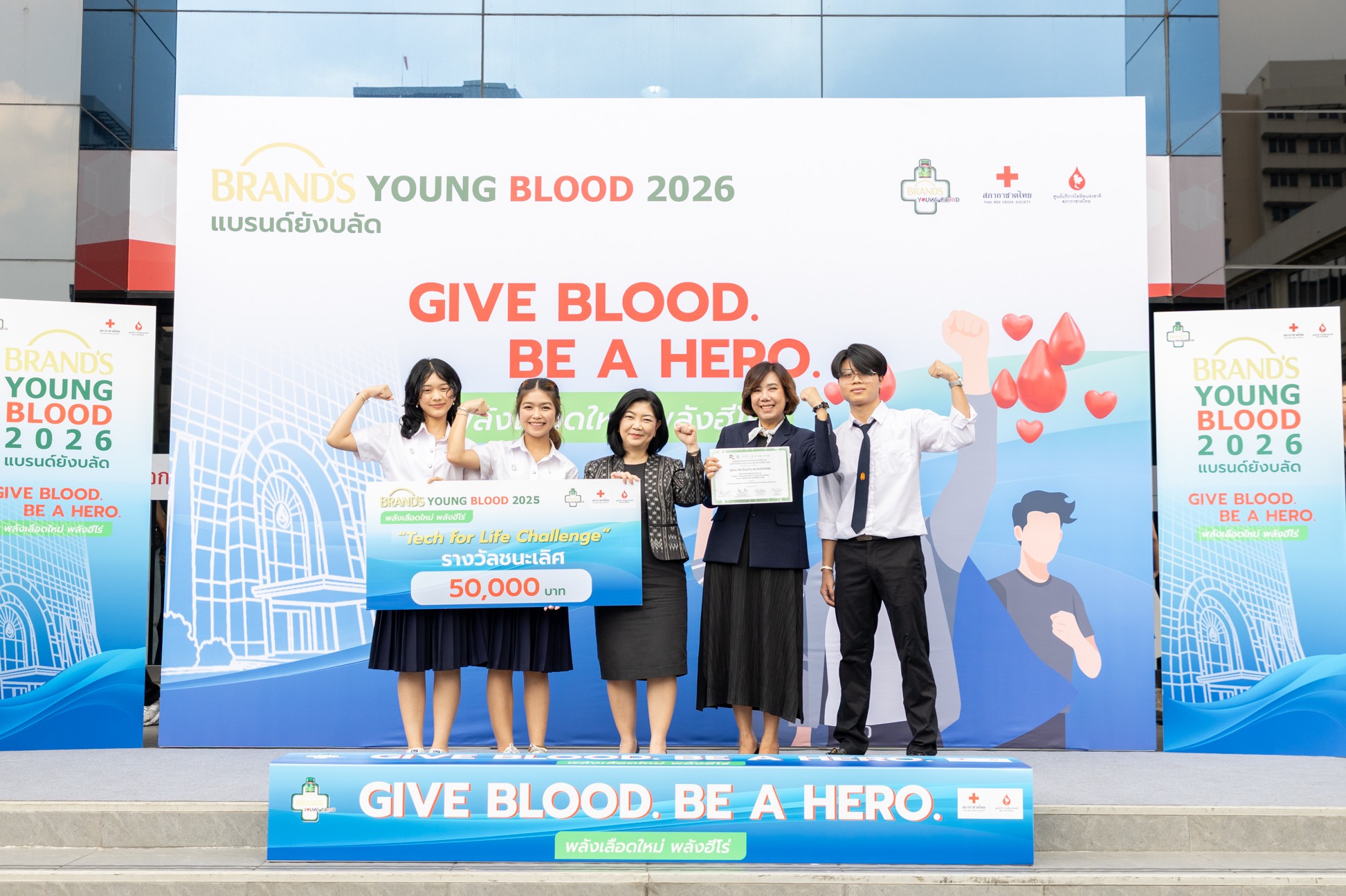 นางมธุวลี สถิตยุทธการ รองประธานบริหารฝ่ายบรรษัทสัมพันธ์ ประเทศไทยและอินโดไชน่า บริษัท ซันโทรี่ เบเวอเรจ แอนด์ ฟู้ด (ประเทศไทย) จำกัด กล่าวว่า “บริษัทฯ มุ่งมั่นสร้างการเปลี่ยนแปลงเชิงบวกให้แก่สังคมไทยอย่างต่อเนื่อง ภายใต้ค่านิยมหลักขององค์กร 'การตอบแทนกลับคืนสู่สังคม (Giving Back to Society)' โดยโครงการ 'แบรนด์ พลังเลือดใหม่ ต่อพลังชีวิต' ถือเป็นหนึ่งในภารกิจสำคัญที่สะท้อนความมุ่งมั่นดังกล่าวอย่างชัดเจน และได้ดำเนินงานมาอย่างต่อเนื่องจนก้าวเข้าสู่ปีที่ 26 ภายใต้โครงการ ‘แบรนด์ พลังเลือดใหม่ ต่อพลังชีวิต ปี 2569 (BRAND'S Young Blood 2026)’ ด้วยแนวคิด 'Give Blood. Be A Hero. พลังเลือดใหม่ พลังฮีโร่' ตั้งเป้าจัดหาโลหิตทั่วประเทศโดยมุ่งส่งเสริมให้เยาวชนไทยมีบทบาทสำคัญในการขับเคลื่อนสังคม ผ่านกิจกรรมสร้างสรรค์หลากหลายรูปแบบ ควบคู่ไปกับการปลูกฝังจิตสำนึกแห่งการเป็น 'ผู้ให้' อันเป็นรากฐานสำคัญของการพัฒนาสังคมไทยอย่างยั่งยืนในระยะยาว ทั้งนี้ จากการดำเนินโครงการฯ ปี 2568 ที่ผ่านมา สามารถรวบรวมโลหิตจากกลุ่มเยาวชนทั่วประเทศที่ร่วมบริจาคโลหิตและส่งมอบให้แก่ศูนย์บริการโลหิตแห่งชาติ สภากาชาดไทย เพื่อสนับสนุนปริมาณโลหิตสำรองคงคลังอย่างต่อเนื่อง พร้อมนำไปช่วยเหลือผู้ป่วยในโรงพยาบาลทั่วประเทศ ทั้งในภาวะปกติและในสถานการณ์ฉุกเฉินได้ ซึ่งสะท้อนถึงพลังร่วมกันของผู้ให้ที่สามารถเปลี่ยน ‘พลังเล็ก ๆ ’ ให้กลายเป็น ‘พลังที่ยิ่งใหญ่’ ได้อย่างแท้จริง โอกาสนี้ ขอแสดงความยินดีกับนิสิตนักศึกษาทั้ง 3 ทีม ที่ได้รับรางวัลจากการประกวด Tech for Life Challenge ซึ่งเป็นกิจกรรมที่ส่งเสริมไอเดียสร้างสรรค์สื่อดิจิทัลเพื่อกระตุ้นการบริจาคโลหิต โดยหวังว่าประสบการณ์จากโครงการฯ จะเป็นแรงบันดาลใจ เสริมสร้างภาวะผู้นำ และปลูกฝังจิตสำนึกด้านความรับผิดชอบต่อสังคมให้แก่เยาวชนทุกคน”