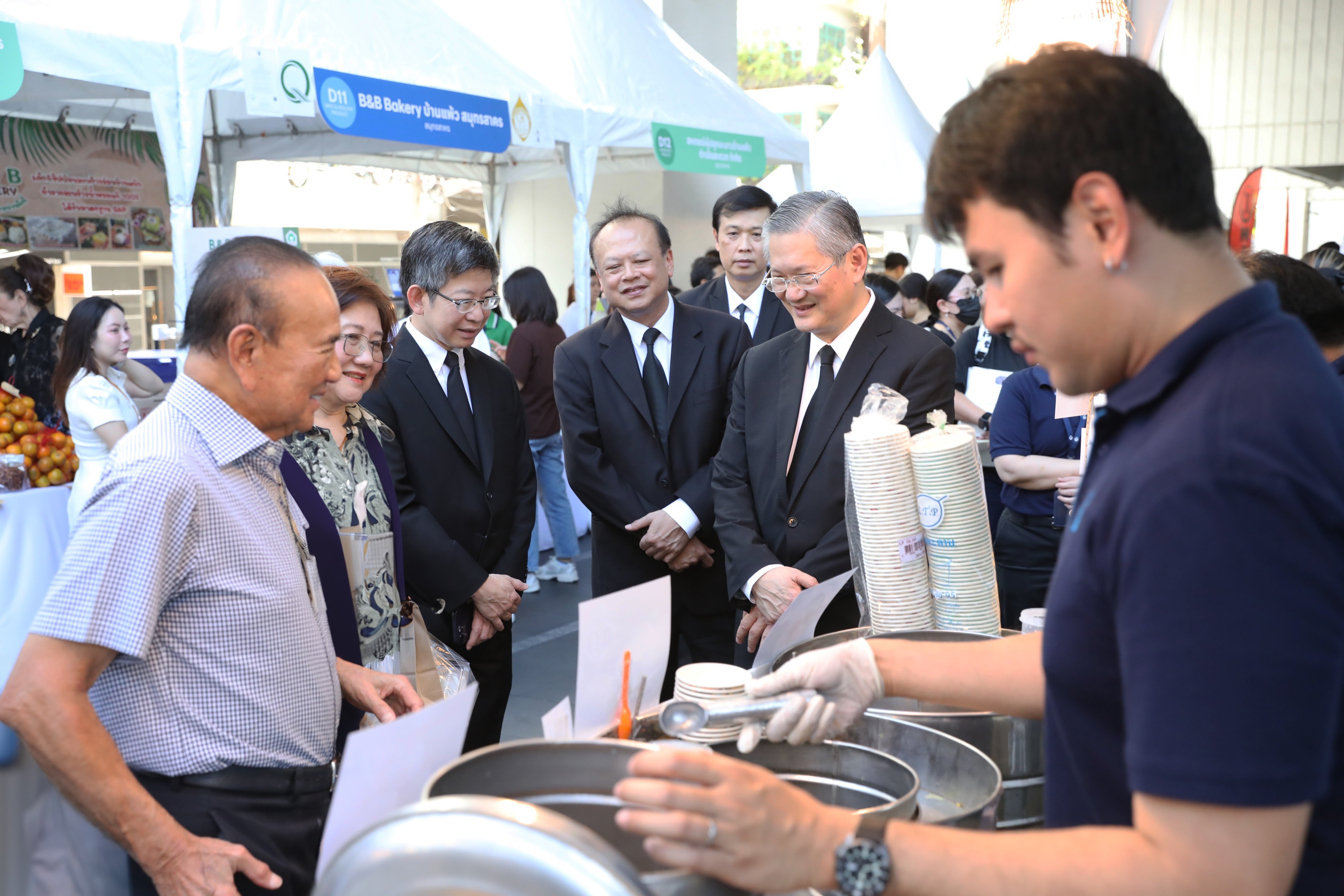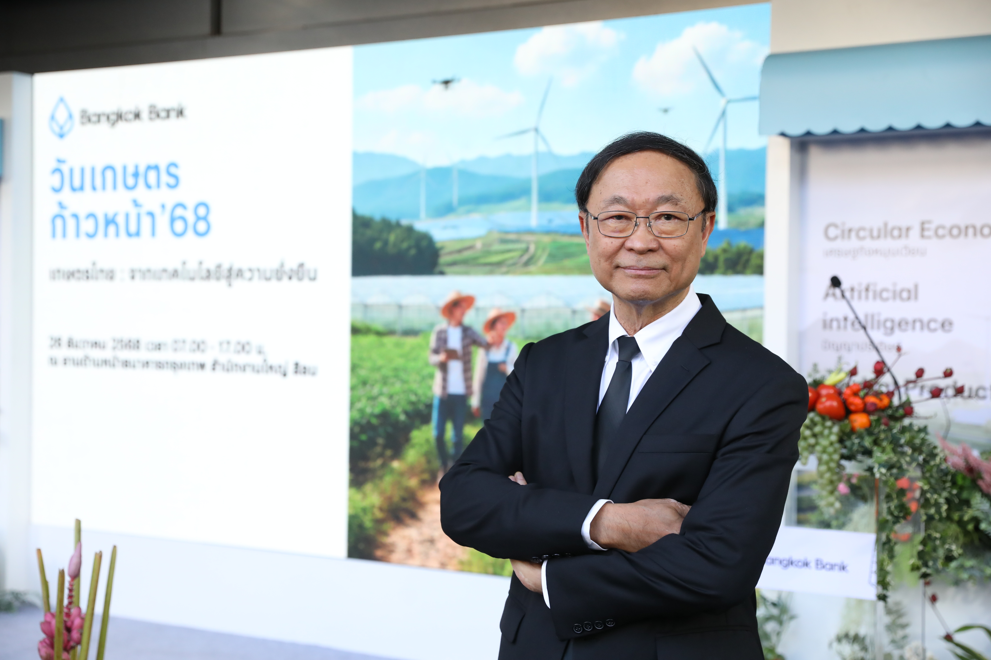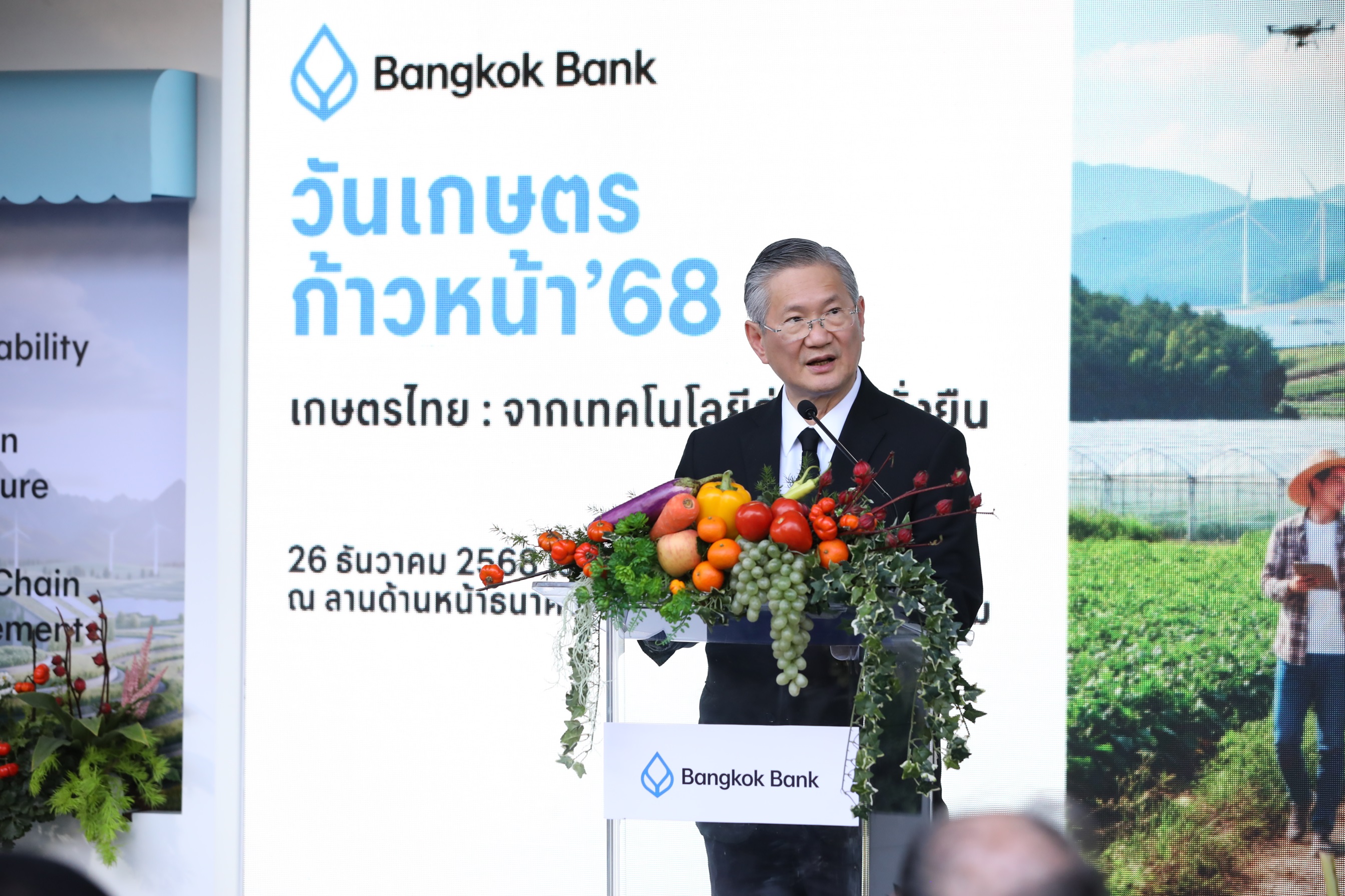 นายพิเชฐ ดุรงคเวโรจน์ กรรมการบริหาร ธนาคารกรุงเทพ จำกัด (มหาชน) กล่าวว่า ธนาคารกรุงเทพ มุ่งมั่นสนับสนุน และผลักดันภาคการเกษตรไทยอย่างต่อเนื่องตลอดระยะเวลากว่า 81 ปี ซึ่งงานมหกรรมจำหน่ายสินค้า วันเกษตรก้าวหน้า’ 68 นี้ จัดขึ้นเพื่อยืนยันเจตนารมณ์ของธนาคารที่จะเป็น “เพื่อนคู่คิด มิตรคู่บ้าน” สนับสนุนและอยู่เคียงข้างให้เกษตรกรไทยสามารถพัฒนาอย่างยั่งยืน พร้อมทั้งเปิดโอกาสให้ภาคเกษตรไทยได้ก้าวสู่เวทีโลกอย่างมั่นคง ด้วยองค์ความรู้ที่ทันสมัย โดยให้ความสำคัญกับประเด็น การเพิ่มผลผลิตและลดความเสี่ยงด้วยเกษตรแม่นยำ (Precision Agriculture) ซึ่งสามารถช่วยลดต้นทุนปุ๋ยและยาได้ 15–40% และเพิ่มผลผลิตได้ถึง 10–30% การพัฒนาคุณภาพผลผลิตให้ได้มาตรฐานสากล เช่น มาตรฐาน GAP Organic Carbon footprint การแปรรูปนวัตกรรม (Agro-processing Innovation) เช่น ถนอมอาหารด้วยนวัตกรรม Food Tech การใช้เครื่องจักรต้นทุนต่ำในระดับชุมชน การส่งเสริมตลาดและราคาด้วยแพลตฟอร์มดิจิทัล เช่น การใช้ AI วิเคราะห์ราคา-ความต้องการ การตรวจสอบย้อนกลับกระบวนการผลิตและการจัดจำหน่าย (Traceability) ผ่าน Blockchain และการใช้นวัตกรรมเทคโนโลยีชีวภาพ (Biotech) เพื่อเพิ่มผลผลิตอย่างมีประสิทธิภาพ เช่น พันธุ์พืชทนแล้ง ทนโรค และสามารถนำวัสดุเหลือทิ้งทางเกษตรกลับมาใช้ประโยชน์เพื่อลดขยะ ซึ่งเป็นนโยบายและแนวทางที่ประชาคมโลกให้ความสำคัญ ลดการปล่อยก๊าซเรือนกระจกในภาคการเกษตร จนไปสู่ Zero waste ในที่สุด