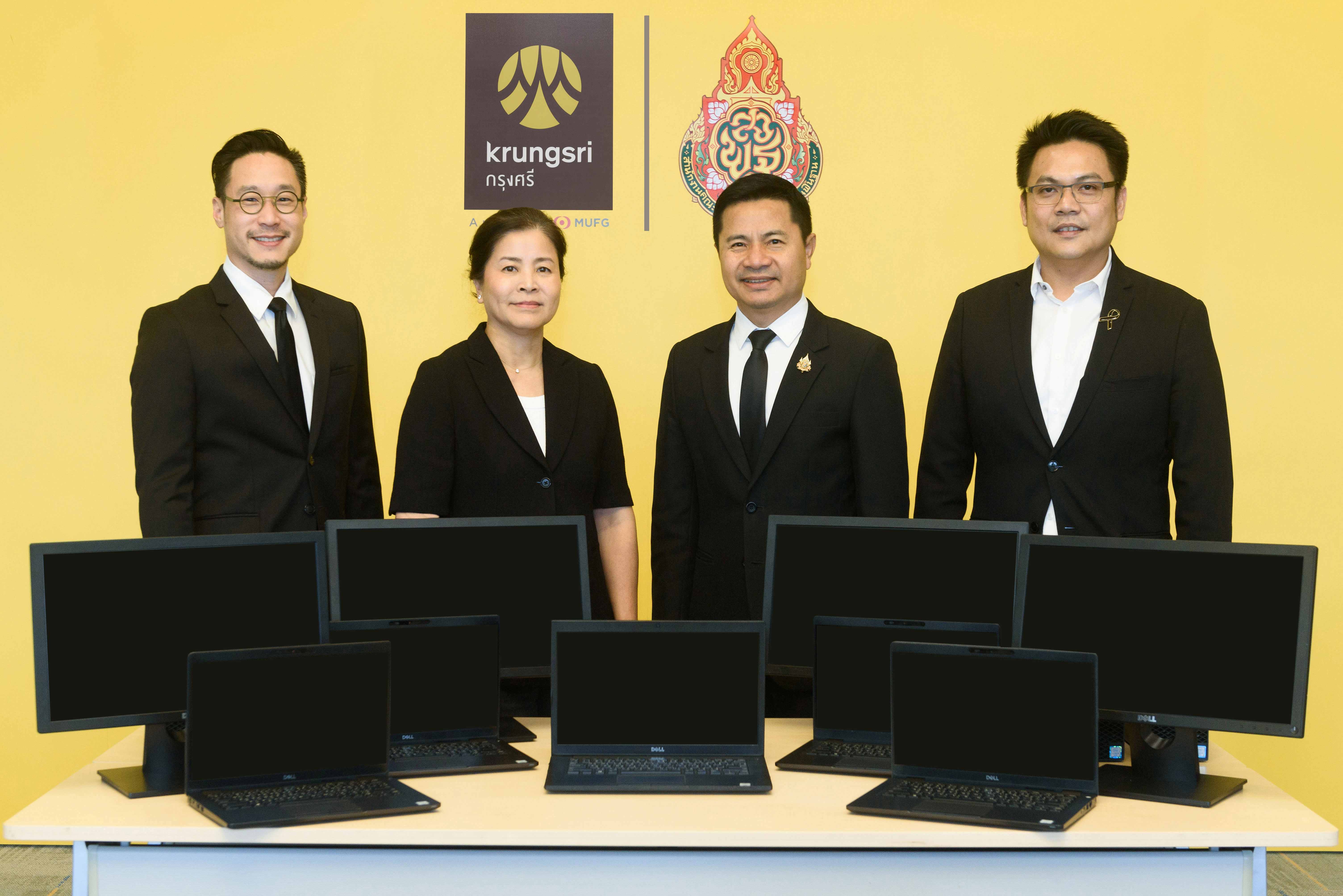 กรุงศรี (ธนาคารกรุงศรีอยุธยา จำกัด (มหาชน)) โดย นางสาวสายสุนีย์ หาญประเทืองศิลป์ (ที่ 2 จากซ้าย) ประธานกลุ่มสนับสนุนธุรกิจด้านเทคโนโลยีสารสนเทศและดิจิทัล และนายพชร วันรัตน์เศรษฐ (ซ้าย) ประธานคณะเจ้าหน้าที่ด้านเทคโนโลยีสารสนเทศ มอบคอมพิวเตอร์พร้อมอุปกรณ์จำนวน 1,300 เครื่อง ให้กับสำนักงานคณะกรรมการการศึกษาขั้นพื้นฐาน (สพฐ.) กระทรวงศึกษาธิการ ต่อเนื่องเป็นปีที่ 3 ตอกย้ำความมุ่งมั่นในการสร้างโอกาสทางการศึกษาอย่างเท่าเทียมและทั่วถึงไปยังพื้นที่ห่างไกล โดยมี นายพิเชฐร์ วันทอง (ที่ 2 จากขวา) รองเลขาธิการคณะกรรมการการศึกษาขั้นพื้นฐาน เป็นผู้แทนรับมอบ