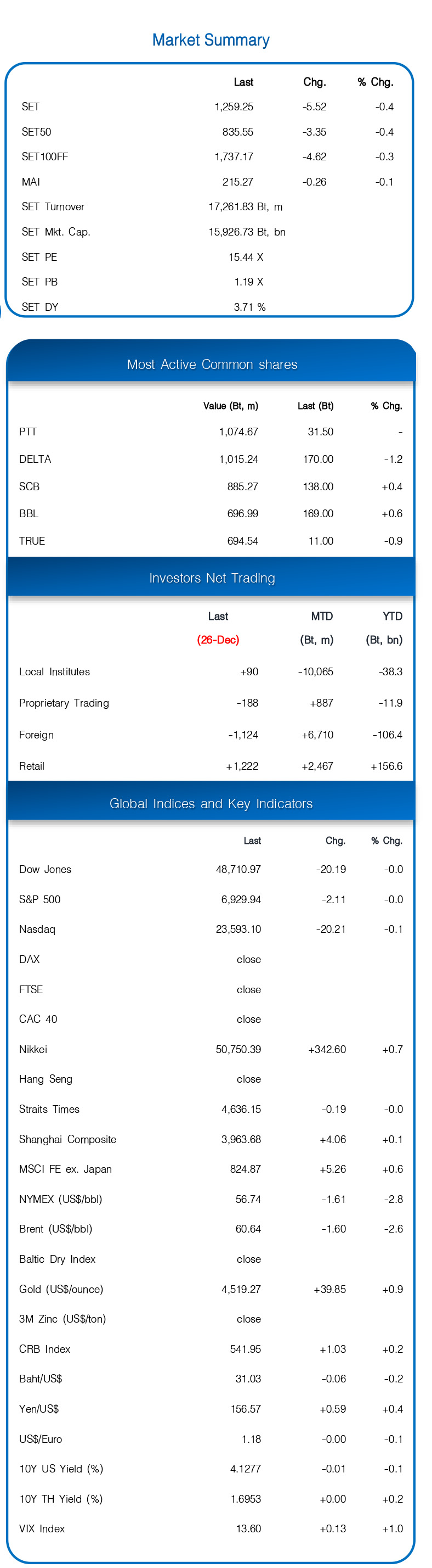 ปรับลงเล็กน้อย – หุ้นสหรัฐฯ ปิดอ่อนตัวลงเล็กน้อย ท่ามกลางหุ้นยุโรปปิดทำการในวัน Boxing Day ภาพรวมการซื้อขายเป็นไปอย่างเงียบเหงาในช่วงเทศกาลคริสต์มาส และคาดการซื้อขายจะเบาบางต่อเนื่องจนถึงสิ้นปี ด้านราคาน้ำมันดิบ WTI -1$ จากความหวังข้อตกลงสันติภาพ โดยปธน.ยูเครนและปธน.สหรัฐฯ จะหารือกันในช่วงสุดสัปดาห์