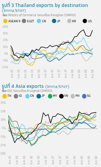 • ASEAN-5: ขยายตัว 5.7%YoY เติบโตต่อเนื่องเป็นเดือนที่ 6 โดยสินค้าสำคัญที่ขยายตัว เช่น โทรศัพท์ คอมพิวเตอร์ และ แผงวงจรไฟฟ้า เป็นต้น ส่วนสินค้าสำคัญที่หดตัว เช่น เคมีภัณฑ์ เครื่องปรับอากาศ ผลิตภัณฑ์ยาง เป็นต้น