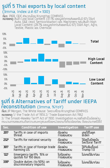 1 สินค้า Low (High) Local Content หมายถึงสินค้าที่มีสัดส่วนการนำเข้าสินค้าทุนหรือวัตถุดิบจากต่างประเทศสูง โดยอ้างอิงจากการศึกษา เรื่อง ภาษีทรัมป์ 2.0 กับความท้าทายต่อภาคการส่งออกไทย (2025) สถาบันวิจัยเศรษฐกิจป๋วย อึ๊งภากรณ์ ธนาคารแห่งประเทศไทย