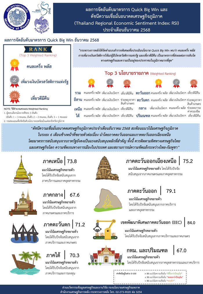 “ดัชนีความเชื่อมั่นอนาคตเศรษฐกิจภูมิภาคประจำเดือนธันวาคม 2568 สะท้อนแนวโน้มเศรษฐกิจภูมิภาคในระยะ 6 เดือนข้างหน้าที่ขยายตัวต่อเนื่อง นำโดยภาคตะวันออกและภาคตะวันออกเฉียงเหนือ โดยมาตรการสนับสนุนจากภาครัฐยังคงเป็นแรงสนับสนุนหลักที่สำคัญ ทั้งนี้ ควรติดตามทิศทางเศรษฐกิจไทยและเศรษฐกิจโลก ความชัดเจนทางการเมืองในประเทศ และสถานการณ์ความขัดแย้งระหว่างไทย-กัมพูชา นอกจากนี้ กระทรวงการคลังได้จัดทำแบบสำรวจพิเศษเพื่อประเมินนโยบาย Quick Big Win พบว่า โครงการคนละครึ่ง พลัส โครงการเพิ่มวงเงินสวัสดิการให้แก่ผู้มีบัตรสวัสดิการแห่งรัฐ ปี 2568 และโครงการเที่ยวดีมีคืน เป็นมาตรการที่ส่งผลต่อการเติบโตทางเศรษฐกิจและความเป็นอยู่ของประชาชนในภูมิภาคมากที่สุด”