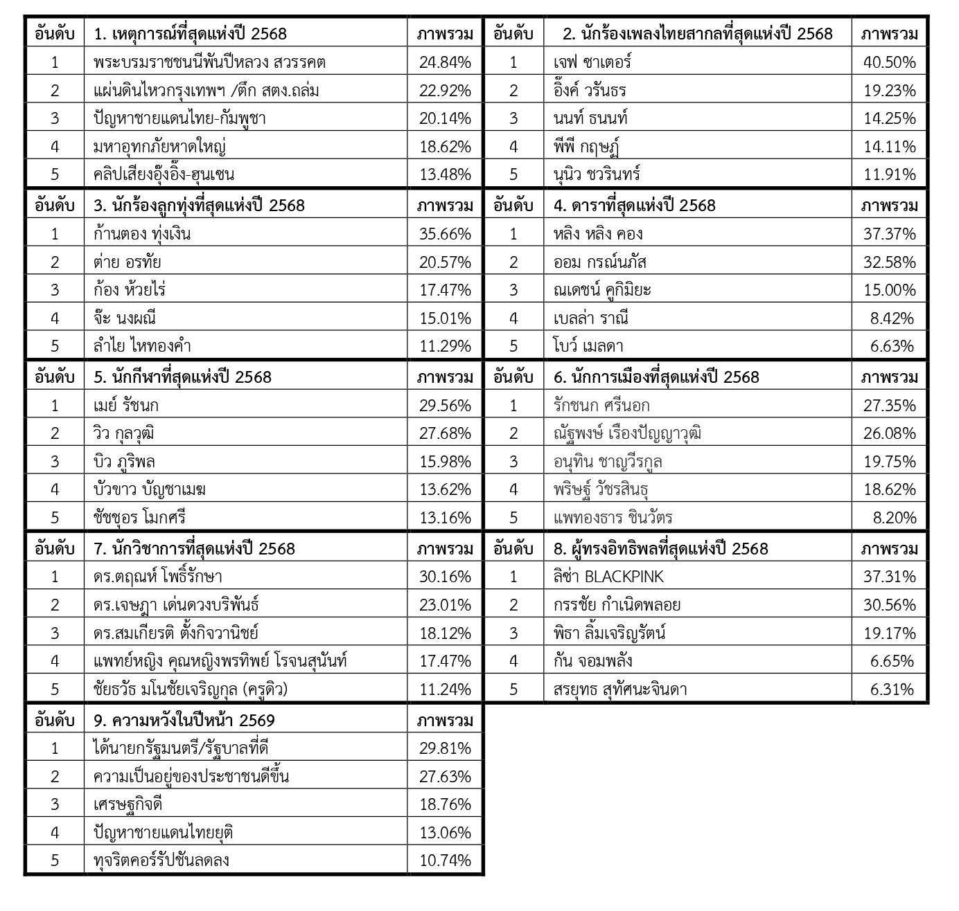 สวนดุสิตโพล มหาวิทยาลัยสวนดุสิต สำรวจความคิดเห็นของประชาชน เรื่อง “ที่สุดแห่งปี 2568” กลุ่มตัวอย่างจำนวน 10,218 คน (สำรวจทางออนไลน์และภาคสนาม) ระหว่างวันที่ 15-26 ธันวาคม 2568 พบว่า เหตุการณ์ที่สุดแห่งปี 2568 คือ พระบรมราชชนนีพันปีหลวง สวรรคต ร้อยละ 24.84 แผ่นดินไหวกรุงเทพฯ /ตึก สตง.ถล่ม ร้อยละ 22.92 และปัญหาชายแดนไทย-กัมพูชา ร้อยละ 20.14 นักร้องเพลงไทยสากลที่สุดแห่งปี คือ เจฟ ซาเตอร์ ร้อยละ 40.50 นักร้องลูกทุ่งที่สุดแห่งปี คือ ก้านตอง ทุ่งเงิน ร้อยละ 35.66 ดาราที่สุดแห่งปี คือ หลิง หลิง คอง ร้อยละ 37.37 นักกีฬาที่สุดแห่งปี คือ เมย์ รัชนก ร้อยละ 29.56 นักการเมืองที่สุดแห่งปี คือ รักชนก ศรีนอก ร้อยละ 27.35 นักวิชาการที่สุดแห่งปี คือ ดร.ตฤณห์ โพธิ์รักษา ร้อยละ 30.16 ผู้ทรงอิทธิพลของไทยแห่งปี คือ ลิซ่า BLACKPINK ร้อยละ 37.31 และความหวังในปีหน้า 2569 คือ ได้นายกรัฐมนตรี/รัฐบาลที่ดี ร้อยละ 29.81 ความเป็นอยู่ของประชาชนดีขึ้น ร้อยละ 27.63