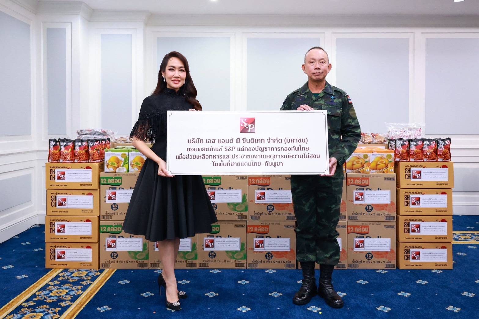 บริษัท เอส แอนด์ พี ซินดิเคท จำกัด (มหาชน) โดย คุณมณีสุดา ศิลาอ่อน ประธานเจ้าหน้าที่สำนักพัฒนาความยั่งยืนและสื่อสารองค์กร มอบผลิตภัณฑ์ S&P ได้แก่ ผลิตภัณฑ์ขนมปังรสช็อกโกแลต ผลิตภัณฑ์ขนมปังใบเตยไส้ถั่วแดง ผลิตภัณฑ์พัฟเค้กครีมกลิ่นใบเตยมะพร้าว ผลิตภัณฑ์พัฟเค้กครีมกลิ่นส้ม ผลิตภัณฑ์กุนเชียงรสซีอิ๊ว และ ผลิตภัณฑ์คางกุ้งทอดกรอบรสหมาล่า รวมจำนวน 11,172 ชิ้น มูลค่ารวม 300,228 บาท เพื่อสนับสนุนการปฏิบัติหน้าที่ของกองทัพ และร่วมส่งกำลังใจให้แก่ทหารและประชาชนที่ได้รับผลกระทบจากเหตุการณ์ความไม่สงบในพื้นที่ชายแดนไทย-กัมพูชา