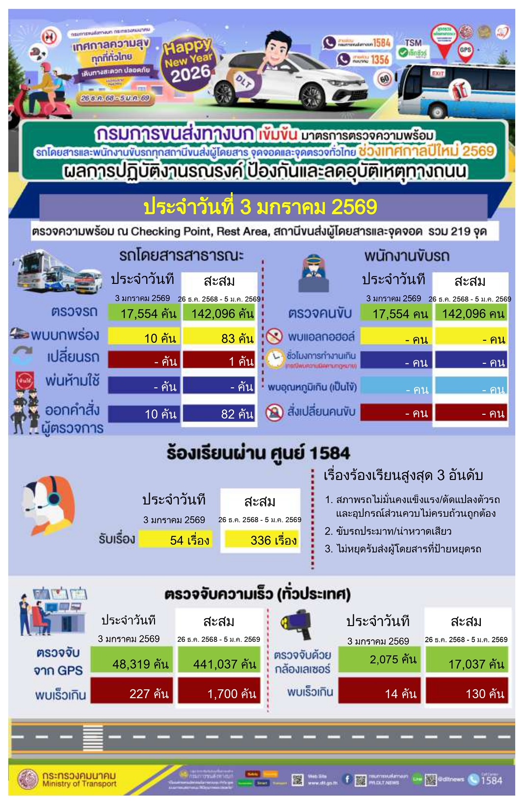 อธิบดีกรมการขนส่งทางบก กล่าวต่อไปว่า หากรถสาธารณะที่ทำผิดกฎหมาย จะดำเนินการบังคับใช้กฎหมายอย่างเข้มงวด โดยนำมาตรการตัดคะแนนใบอนุญาตขับรถมาบังคับใช้ ซึ่งมีโทษถึงขั้นพักใช้หรือเพิกถอนใบอนุญาตขับรถ กรณีประชาชนประสบปัญหาหรือถูกเอารัดเอาเปรียบจากการใช้บริการรถสาธารณะสามารถร้องเรียนได้ที่สายด่วน 1584 ตลอด 24 ชั่วโมง, dlt_1584complain@hotmail.com< mailto:dlt_1584complain@hotmail.com> , Facebook ชื่อ “1584 ร้องเรียนรถโดยสารสาธารณะ”, Line: @1584dlt และแอปพลิเคชัน DLT GPS เป็นต้น