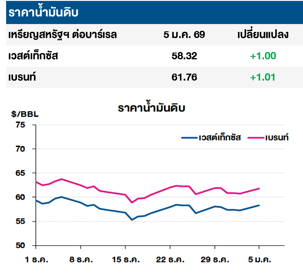 (+/-) ราคาน้ำมันดิบเวสต์เท็กซัสและเบรนท์ปรับเพิ่มขึ้นกว่า 1 เหรียญสหรัฐฯ ต่อบาร์เรล หลังตลาดกังวลเรื่องความไม่แน่นอนเกี่ยวกับการผลิตและส่งออกน้ำมันดิบจากเวเนซุเอลา ภายหลังสหรัฐฯ เปิดปฏิบัติการทางทหารจับกุมประธานาธิบดีนิโคลัส มาดูโร และภรรยาเมื่อวันอาทิตย์ที่ผ่านมา โดยเวเนซุเอลามีแหล่งสำรองน้ำมันดิบที่ใหญ่ที่สุดในโลกราว 3 แสนล้านบาร์เรลหรือคิดเป็น 17% ของปริมาณน้ำมันดิบสำรองทั่วโลก และยังอยู่ภายใต้การคว่ำบาตรของสหรัฐฯ ซึ่งยังคงมีผลบังคับใช้ ทั้งนี้ หลายฝ่ายคาดว่า ผลกระทบในระยะสั้นยังมีความไม่แน่นอนทั้งเรื่องการเปลี่ยนแปลงทางการเมืองในเวเนซุเอลาที่อาจกระทบต่อการผลิตน้ำมันดิบ และมาตรการคว่ำบาตรของสหรัฐฯ ขณะที่ระยะยาวคาดว่าการที่สหรัฐฯ เข้ามาลงทุนในแหล่งน้ำมันดิบเวเนซุเอลา จะส่งผลให้น้ำมันดิบจากเวเนซุเอลาไหลสู่ตลาดโลกเพิ่มขึ้นได้ ทั้งนี้ สหรัฐฯ มีแผนจะประชุมกับผู้บริหารบริษัทน้ำมันรายใหญ่ของสหรัฐฯ ในสัปดาห์นี้