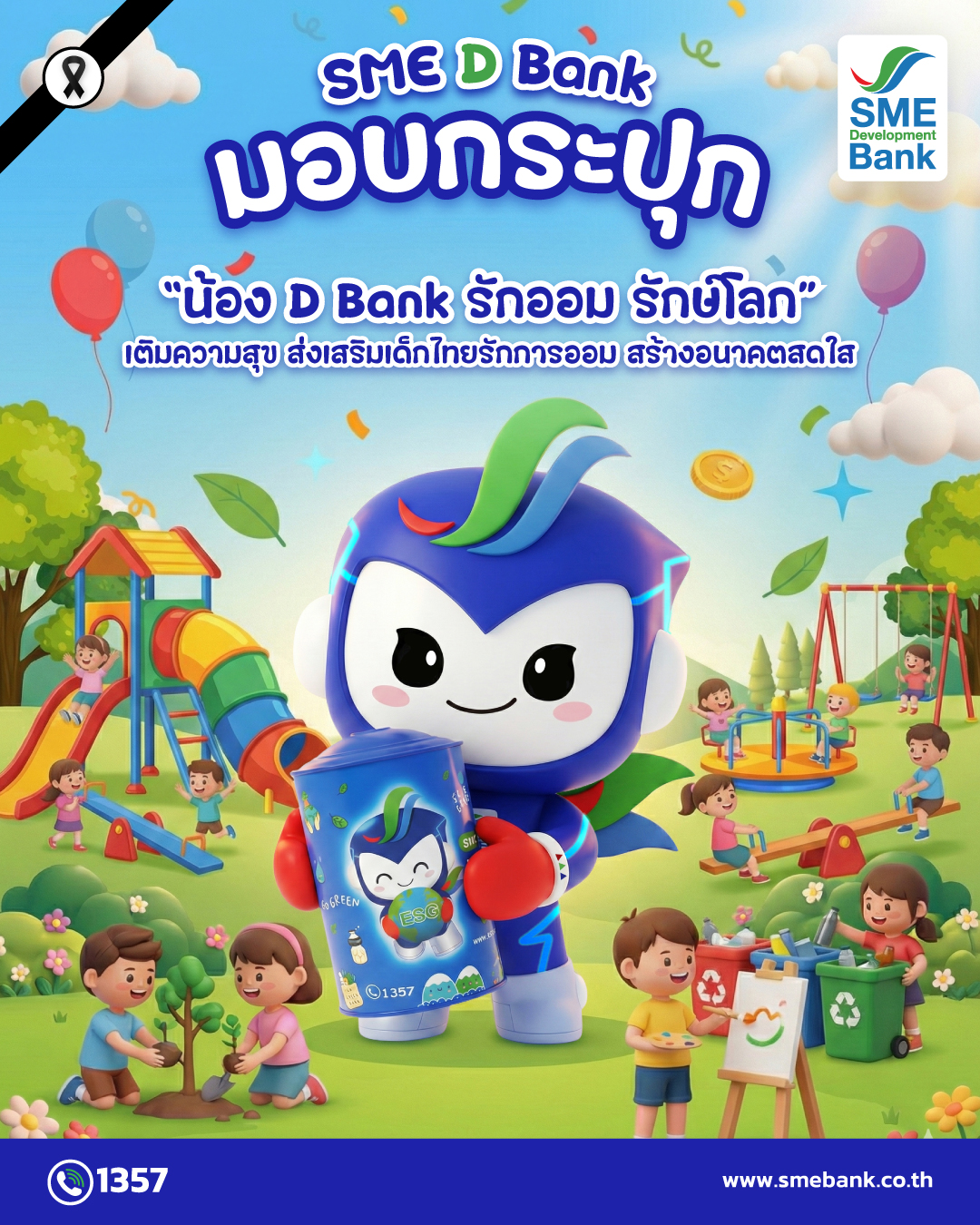 ธนาคารพัฒนาวิสาหกิจขนาดกลางและขนาดย่อมแห่งประเทศไทย (ธพว.) หรือ SME D Bank โดย นายเดชา จาตุธนานันท์ ประธานกรรมการธนาคาร นายพิชิต มิทราวงศ์ กรรมการผู้จัดการ พร้อมคณะผู้บริหาร ส่งมอบกระปุกออมทรัพย์ ในชื่อ "น้อง D Bank รักออม รักษ์โลก" ให้แก่หน่วยงานต่างๆ ทั่วประเทศ เช่น โรงเรียน มูลนิธิ หน่วยงานปกครองท้องถิ่น และหน่วยงานทหาร-ตำรวจ เป็นต้น เพื่อนำไปมอบเป็นของขวัญให้แก่เด็กๆ ในการจัดกิจกรรม "วันเด็กแห่งชาติ ประจำปี 2569" ตามสถานที่ต่างๆ ทั่วประเทศ ในวันเสาร์ที่ 11 มกราคม 2569 นี้ เพื่อเติมความสุข และปลูกจิตสำนึกให้เด็กไทยรักการออม รวมถึง สอดแทรกแนวคิดให้คำนึงถึงการสร้างคุณค่าที่ดีแก่สังคม เศรษฐกิจ และสิ่งแวดล้อม ตามแนวทาง ESG (Environmental Social Governance) เพื่อให้เด็ก ๆ เติบโตมีอนาคตสดใส เป็นผู้ใหญ่ที่มีคุณภาพ เป็นกำลังสำคัญในการพัฒนาประเทศให้เติบโตเข้มแข็งยั่งยืน